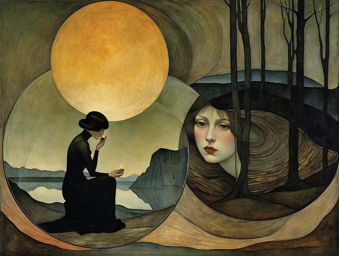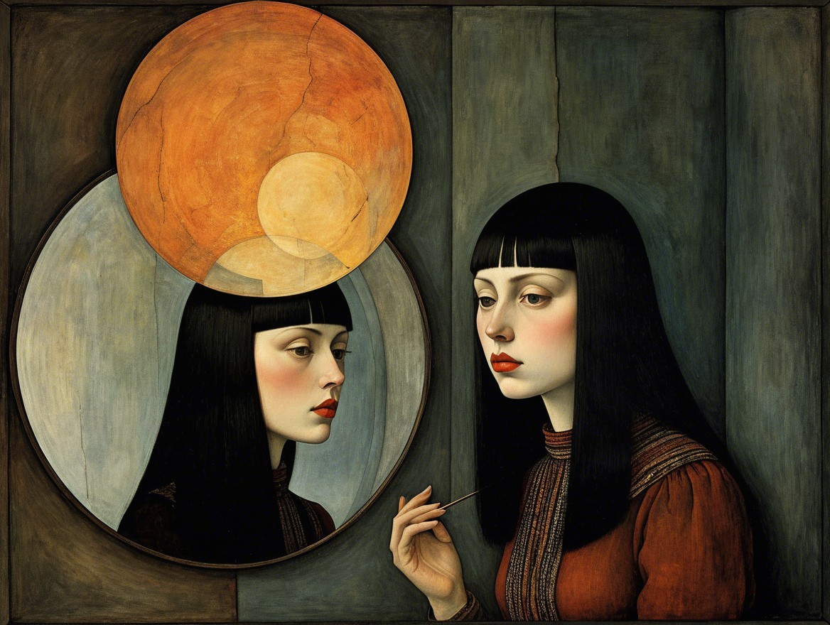 A woman with striking red hair and a sleek black outfit gazes thoughtfully at her reflection in a mirror, holding a glass, exuding a sense of mystery and introspection.