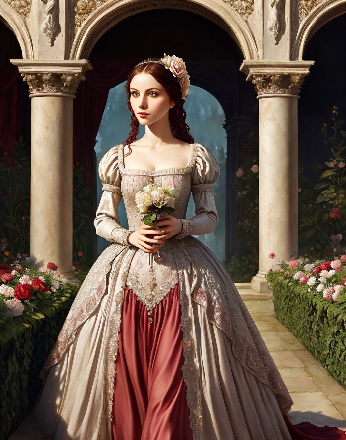 Prompt: award winning masterpiece in Catrin Weiz Stein style, mixed media of beautiful Juliet Capulet walking in a lush beautiful roman garden with beautiful blooms. Renaissance era.