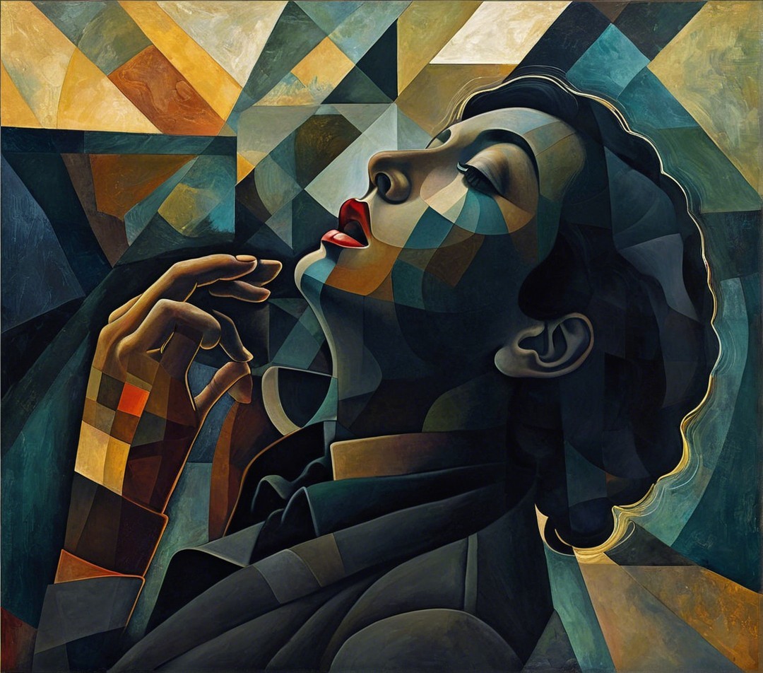 A stylized portrait of a woman with a sophisticated expression, elegantly holding her finger to her lips. The background features geometric shapes in warm and cool tones, enhancing her allure.