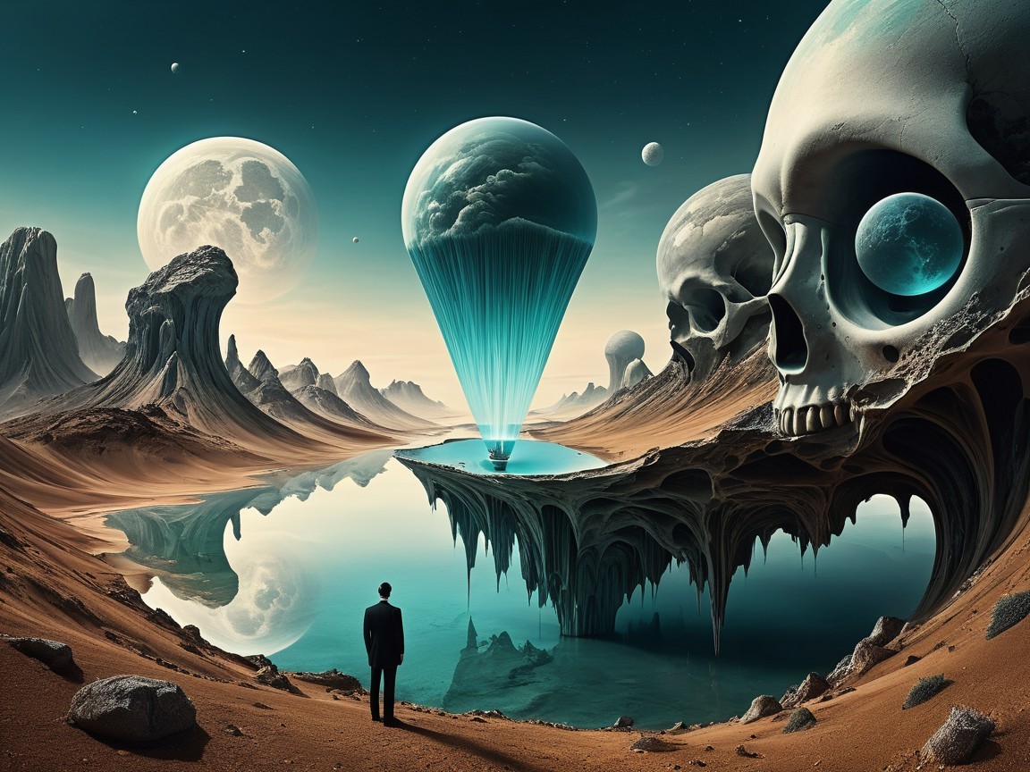 A surreal landscape features towering skulls, a serene lake, and ethereal floating spheres. A lone figure stands in awe, surrounded by otherworldly terrain and distant moons, evoking a sense of cosmic wonder.