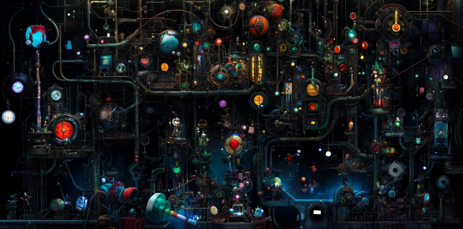 An intricate image showing a man with a megaphone in a detailed steampunk-style machinery environment with various gadgets and pipes.