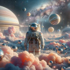 An astronaut stands on fluffy pink clouds amid a cosmic landscape, surrounded by various planets and shimmering spheres, under a starry sky filled with vibrant colors and galaxy patterns.