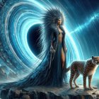 A cosmic scene features a regal figure in an ornate gown with a majestic headdress, standing beside a leopard, against a backdrop of a swirling black hole and starry mountains.