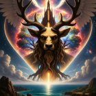 A majestic stag with elaborate antlers crowned with a jewel sits amidst a mystical landscape. Ethereal light radiates behind, highlighting vibrant flora and a serene, enchanting atmosphere.