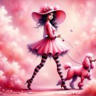 A whimsical, stylish figure in a pink, fluffy dress dances amidst vibrant pink trees. Two elegant poodles accompany her, adding charm to the enchanting scene complete with a wide-brimmed hat.