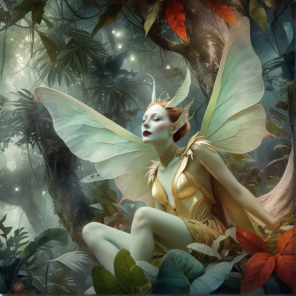 Close up, ghostly amused beautiful Amazonian Luna moth goddess in a jungle dreamscape in the style of Alexander Jansson. by Catrin Welz-Stein, Michael Parkes