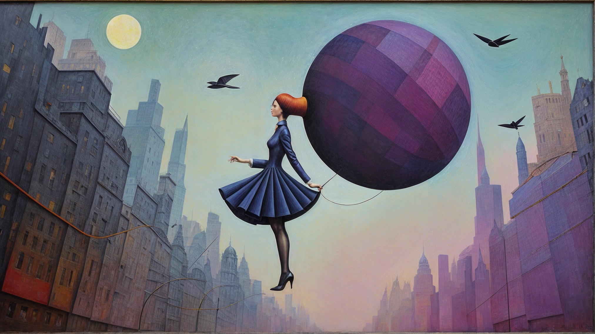 A surreal cityscape features a tall, stylized woman in a blue dress, standing confidently beside a giant, geometric face in the sky, under a glowing moon. The buildings are colorful and whimsical.