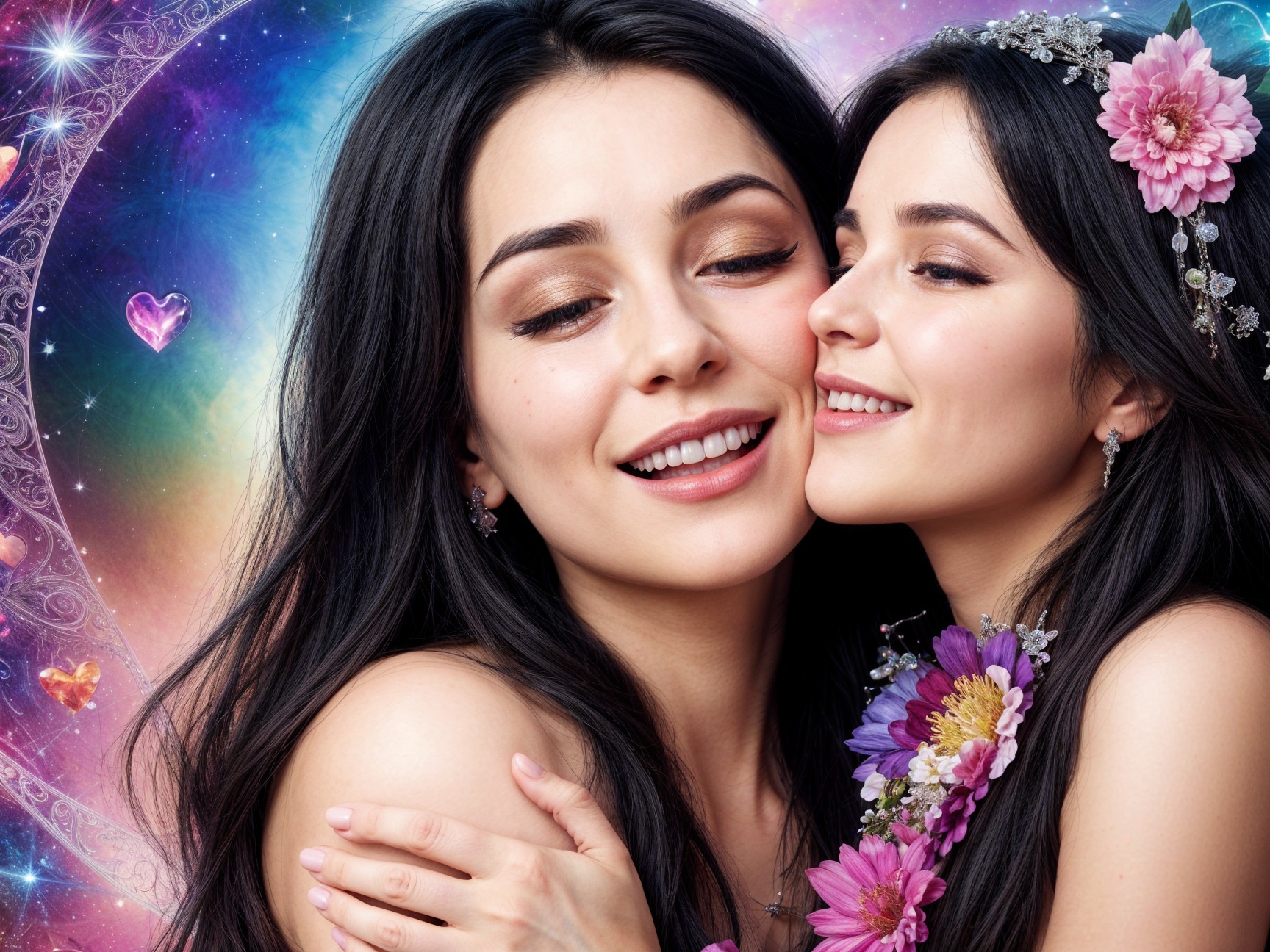 Two women share a joyful embrace, smiling warmly at each other amidst a backdrop of soft pink blossoms. Their hair flows gently, and one has a pink flower accentuating her look.