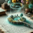 A whimsical scene inside a glass globe features a serene landscape with a tree, a river, a dog, and playful birds. Surrounding the globe are cozy houses and potted plants, creating a magical atmosphere.
