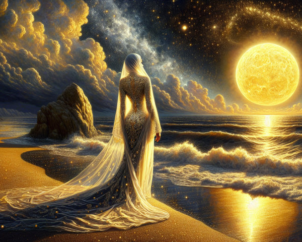 A fantasy artwork of a woman with flowing red hair sitting by a tranquil forest waterfall, surrounded by rich autumn colors.