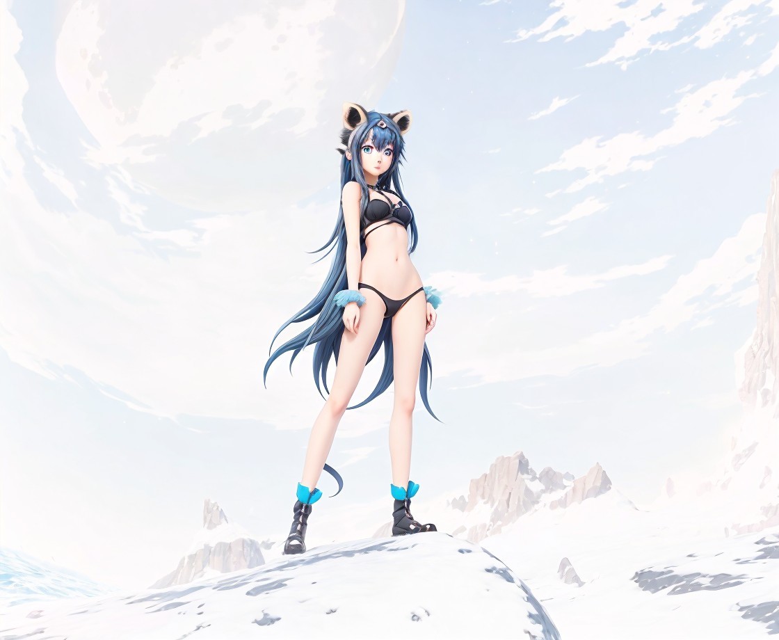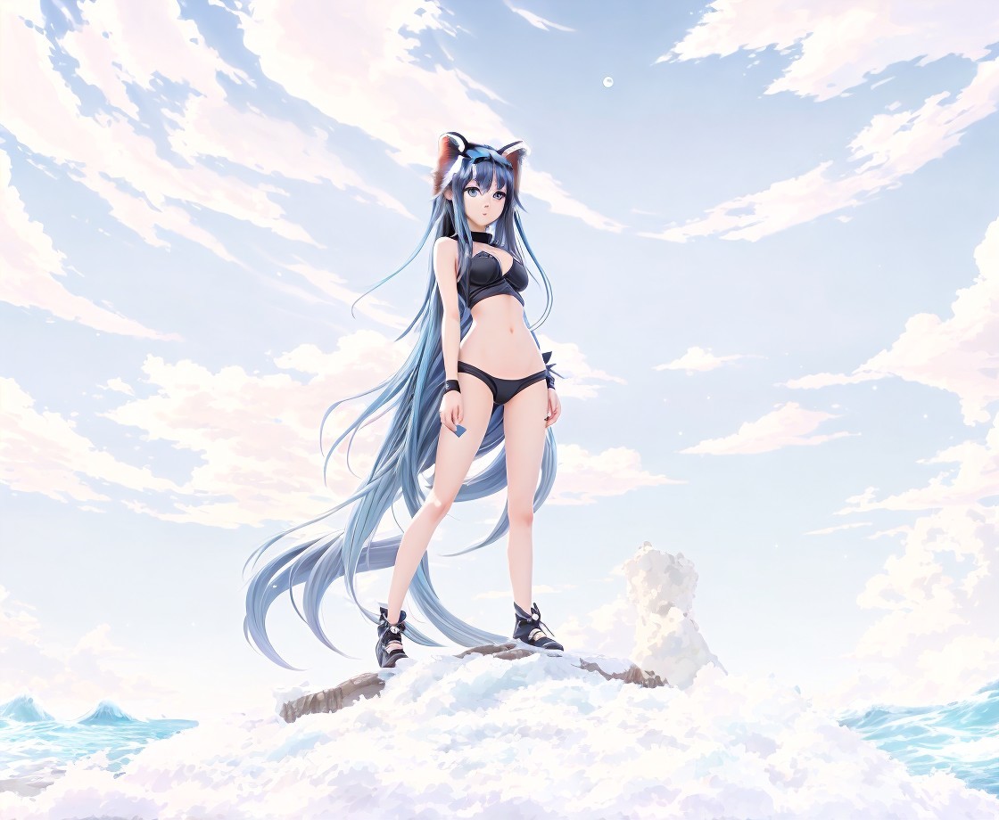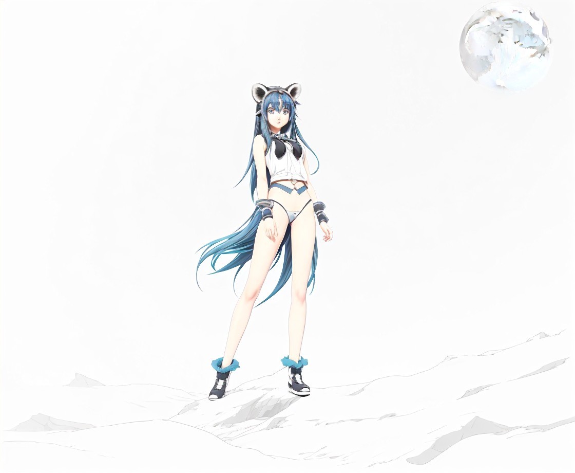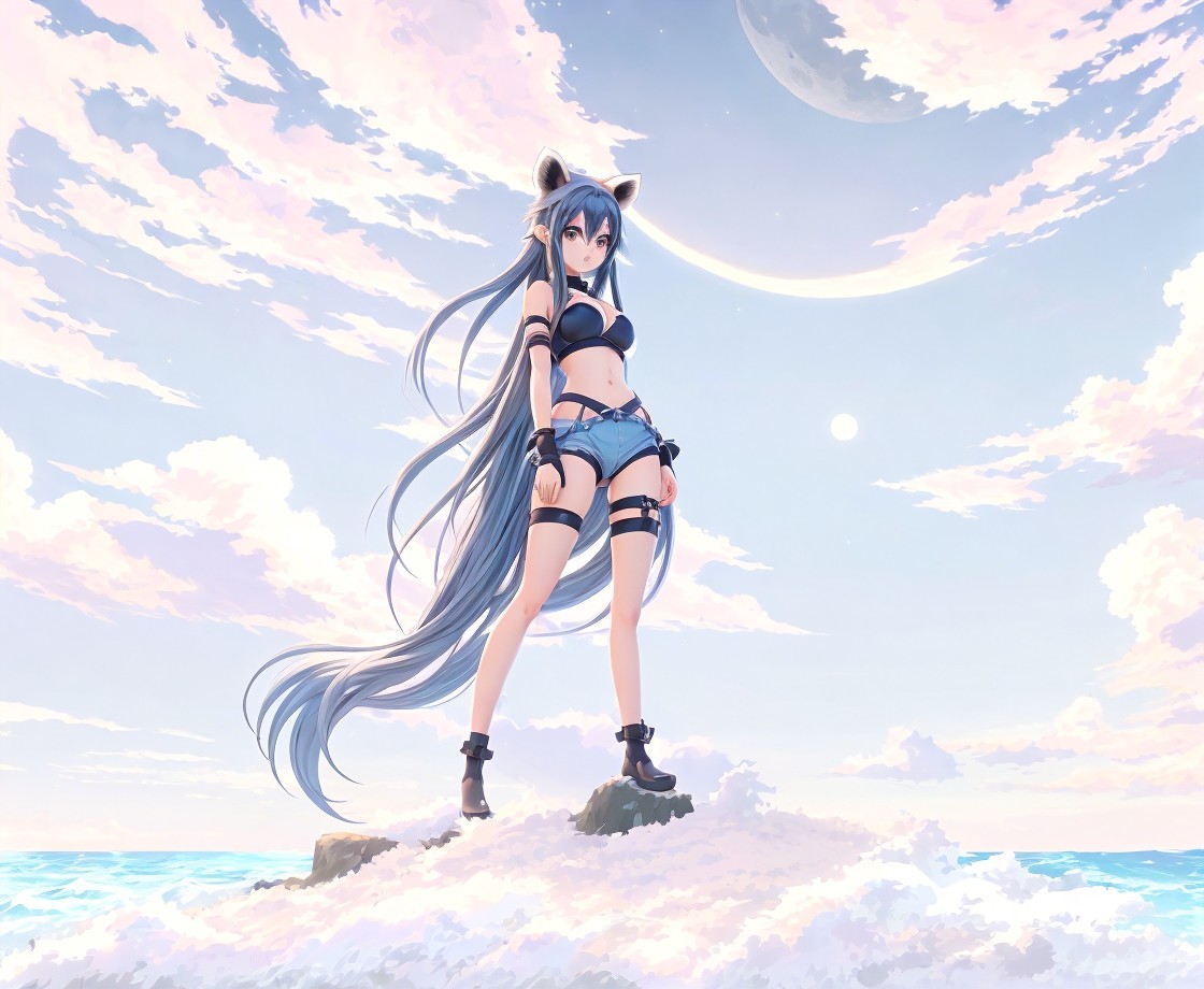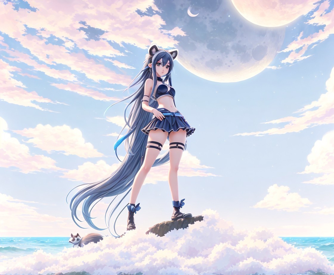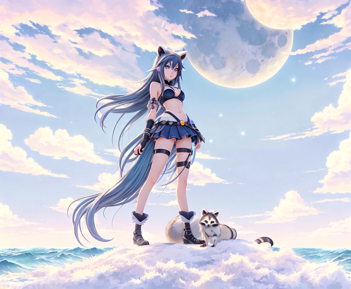 Anime girl with long hair stands with a raccoon under a large moon amidst clouds.