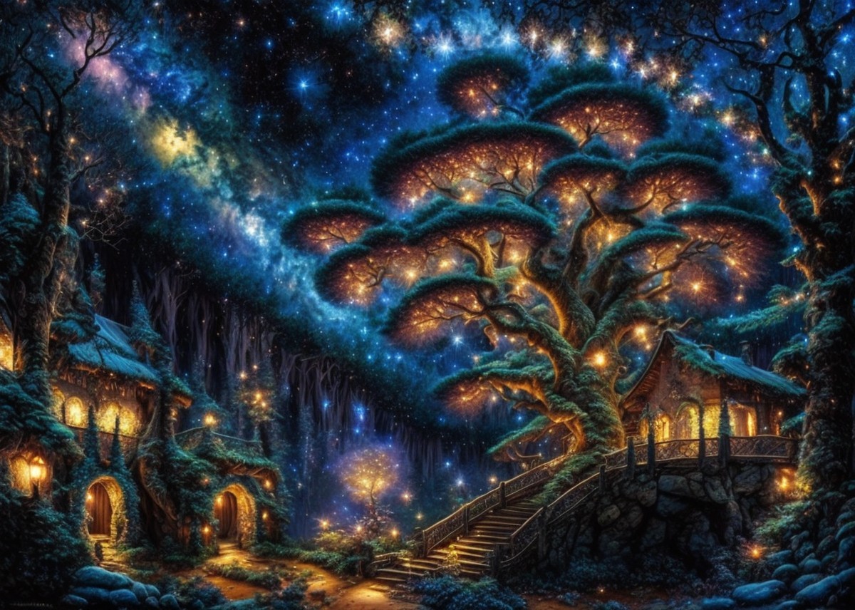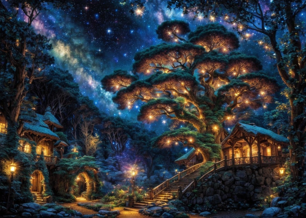 A nighttime fantasy forest scene with illuminated trees, cozy cottages, and a starry sky.