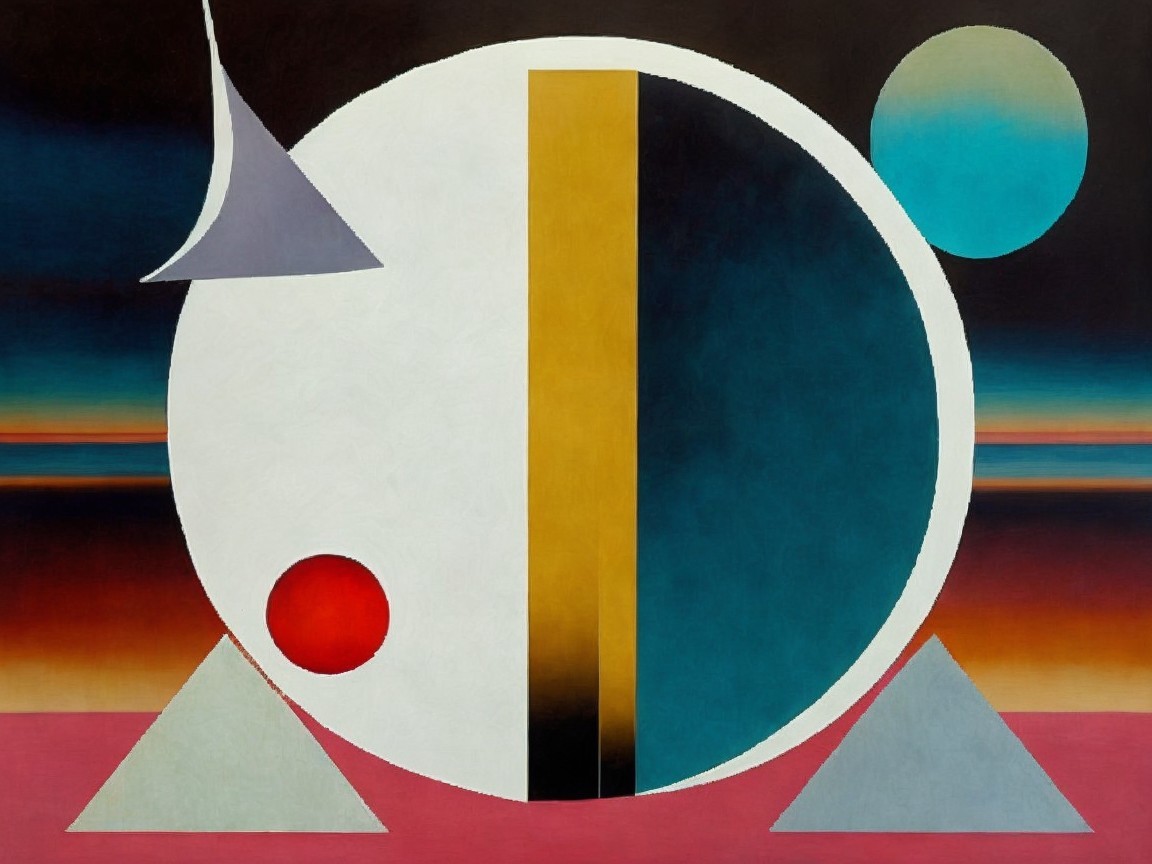 The painting features a large central circle divided into sections with bold colors, accompanied by geometric shapes like a red circle, blue semi-circle, and white and gray triangles against a vibrant background.