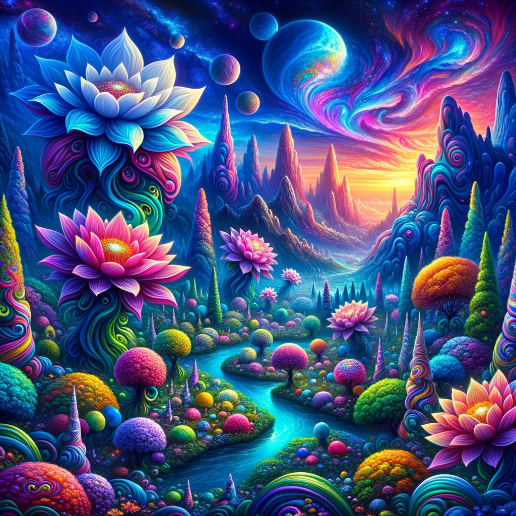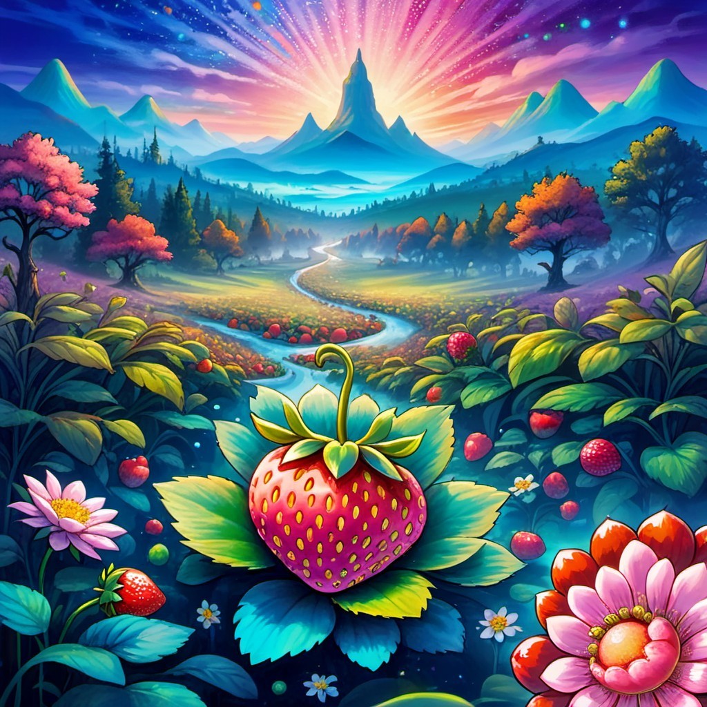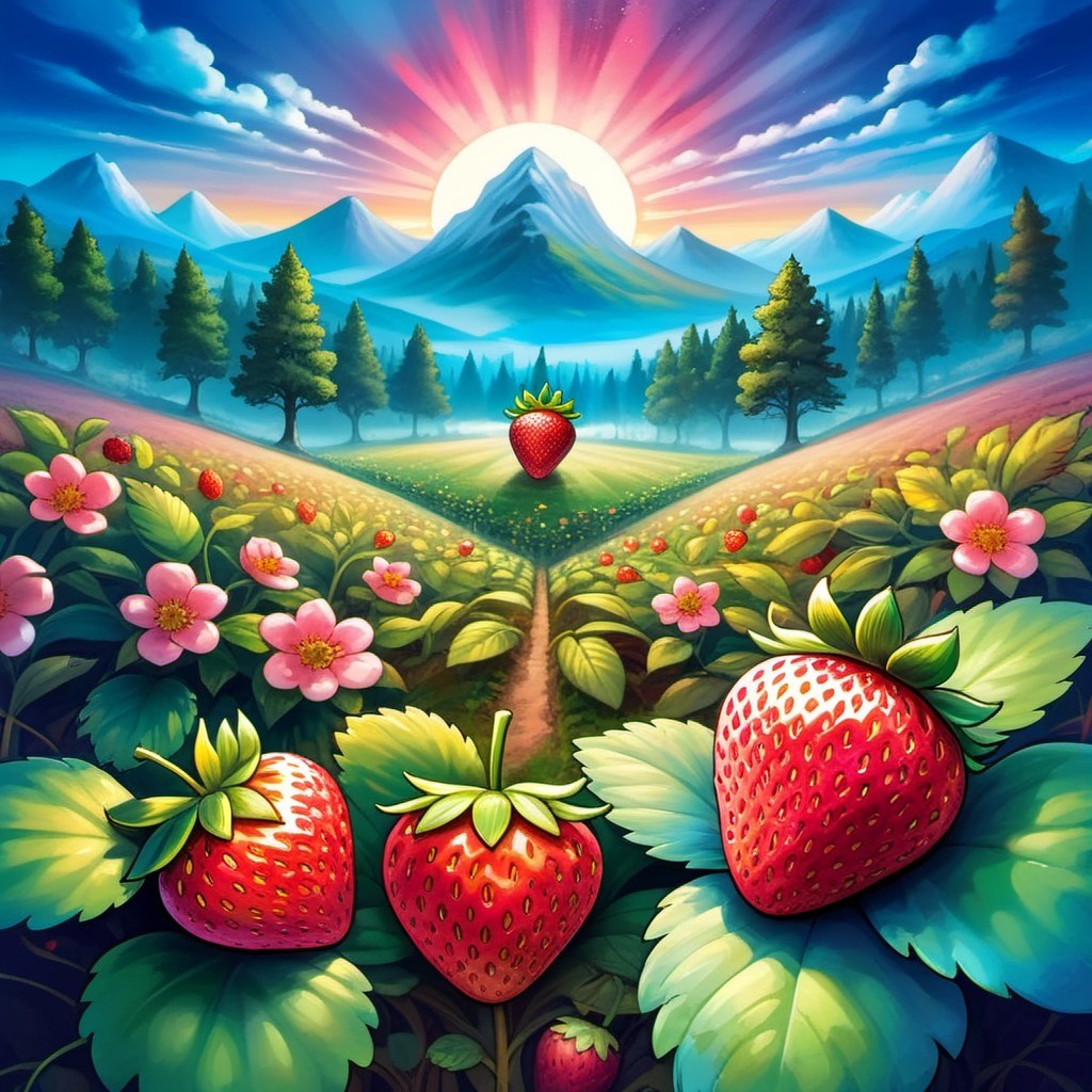 A vibrant illustration of a strawberry field with a grand mountain backdrop under a bright sun.