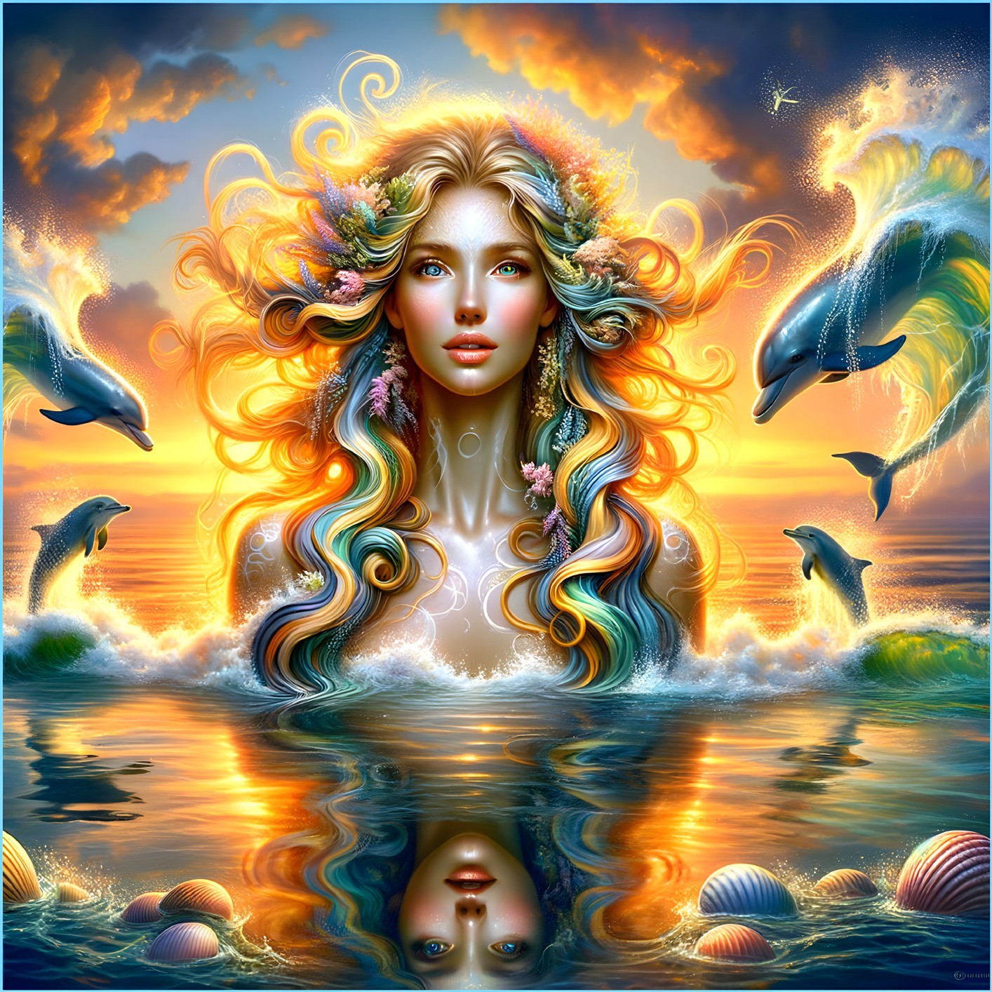 A divine scene unfolds as a goddess emerges from the sea at sunrise, embodying beauty and love. Surrounded by sea creatures, her enchanting presence exudes charm and magic, creating a mesmerizing and poetic image of elegance and grace.