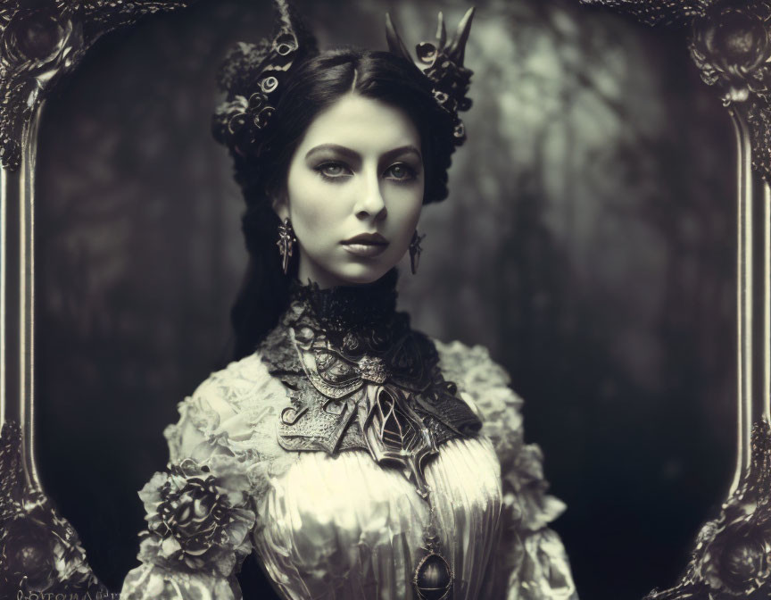 Vintage Gothic Woman Portrait with Elaborate Attire and Oval Frame