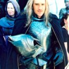 A young knight stands resolutely in intricate armor, glinting in the sunlight. Behind him, a majestic horse and a stunning coastal landscape create a dramatic backdrop.