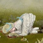 A surreal scene features a large, elegantly dressed figure lying on the ground, while a small, doll-like figure holds a cupcake. The landscape is whimsical, adorned with flowers and a distant castle.