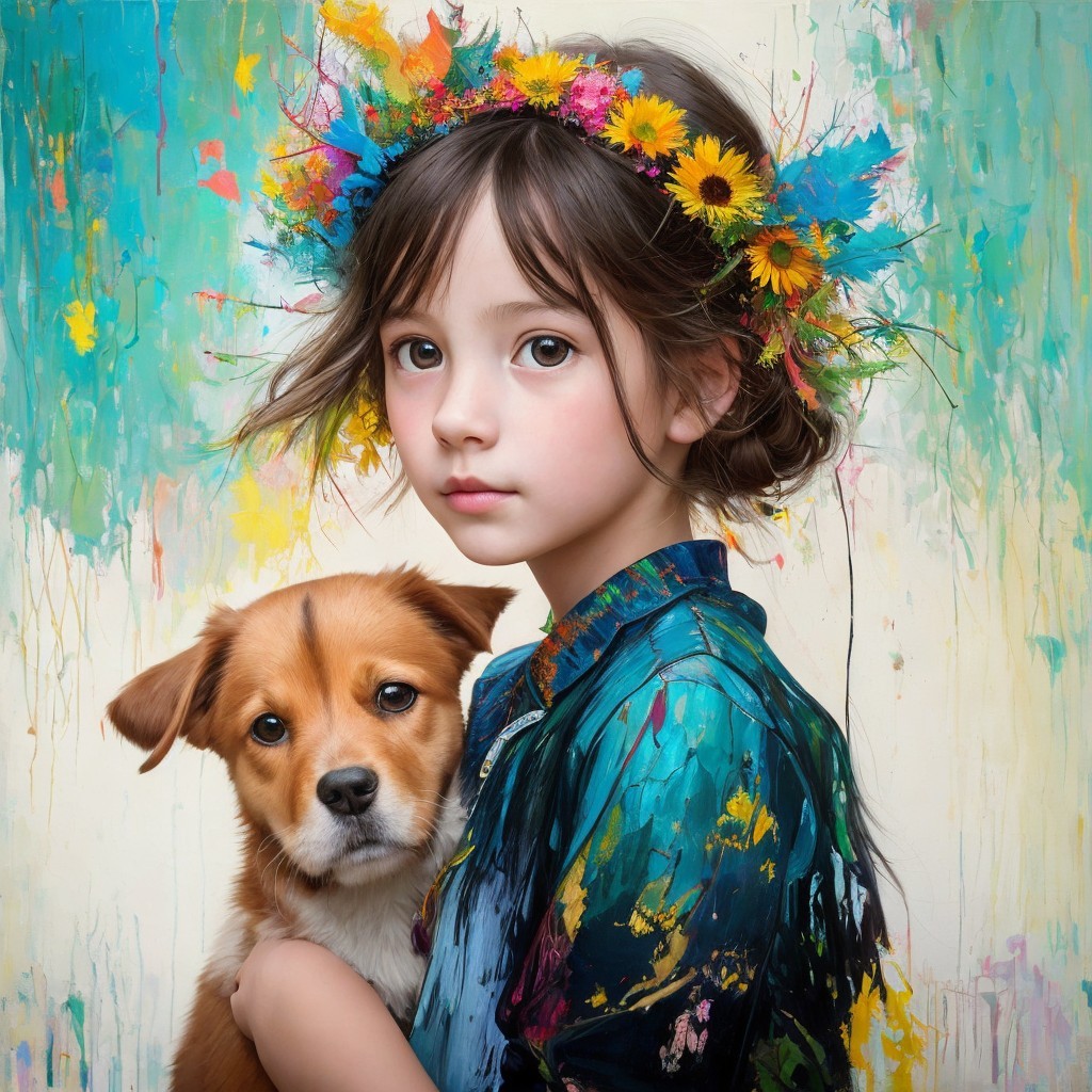 Prompt: "Masterfully surreal contemporary masterpiece featuring A young girl and her dog i journey depicted in a realist style, featuring a portrait with vibrant colors. The girl is captured with one hand posed thoughtfully under her chin. The artwork is an oil painting, highly detailed, and reminiscent of ancient art. The piece is a masterpiece by Carne Griffiths, incorporating elements inspired by Vincent van Gogh, Luis Royo, Endre Pevanoc, and Alberto Seveso. The image is created with the precision of Waterhouse, using a Nikon D850 for sharp focus and award-winning photography techniques. The lighting is cinematic, enhancing the beauty of the painting. The artwork is hyperrealistic, ultra-detailed, and high definition, ensuring crisp quality. The color palette is rich and colorful, with HDR effects and cinematic post-processing to elevate the visual impact. Volumetric lighting Battista Bracelli's textured layers, kinetic designs, and Sampad's precise linework. Explore a world of sublime moiré lines, shapes, and patterns akin to a textile patchwork by Iris van Herpen, Sampad, Carloz Cruz Diezt, and more. Incorporate influences from Victor Vasarely and Alexander McQueen for a futuristic, moiré-rich ambiance. Dive into moiré's complexity with interference patterns, beat patterns, and fringe patterns, creating a visually intricate experience. blending esoteric aesthetics with glitch strokes and collage-like details. Rendered hyperrealistically in 3D, the scene should be illuminated with cinematic depth, utilizing V-Ray tracing for an exquisite 8K resolution finish."