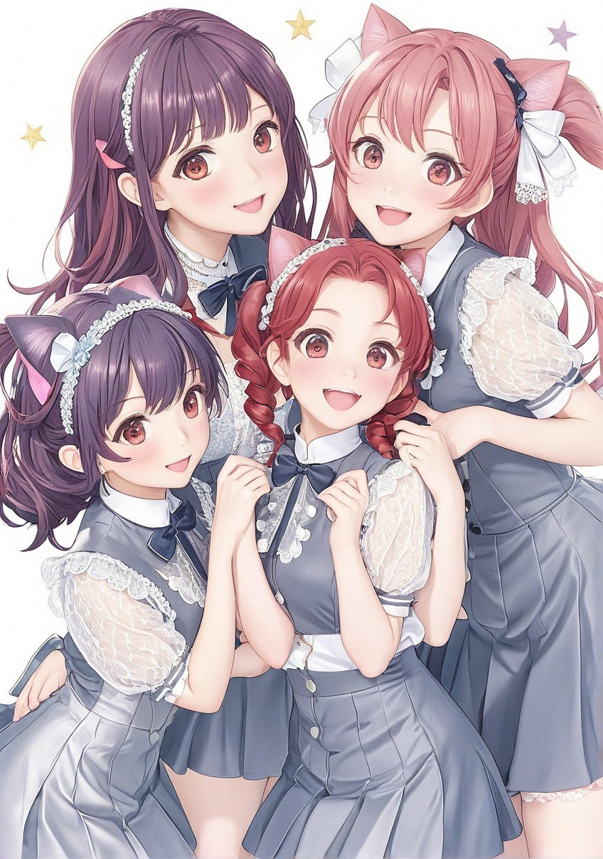Four cheerful young girls with red hair styled variously, wearing cat-themed accessories and matching grey outfits. They pose playfully against a light, starry background, exuding a fun and friendly vibe.
