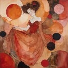 A woman with striking features sits elegantly, wearing a vibrant, flowing dress in shades of red and orange. Her large, curly hair is adorned with circular patterns, complementing her bold makeup.