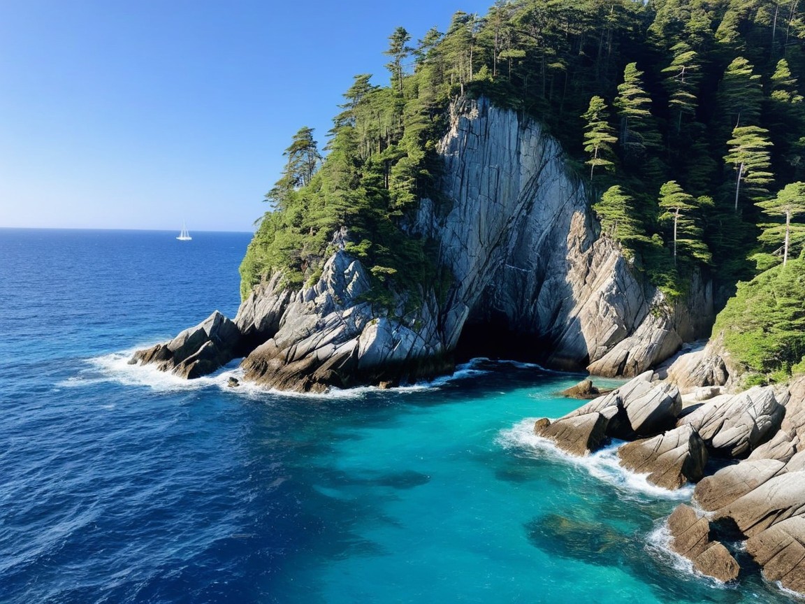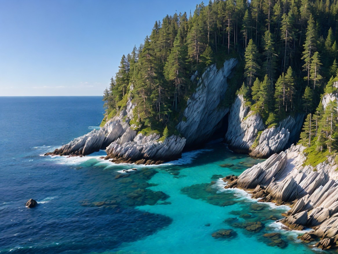 A stunning coastal scene featuring towering rocky cliffs surrounded by clear turquoise waters and scattered boulders. Lush green forests rise above the shoreline under a bright blue sky.