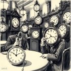 In a vintage shop filled with ornate clocks, two men sit at a table, their faces oversized clock faces, as a third man watches from the background, creating an eerie, surreal atmosphere.