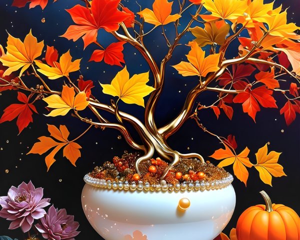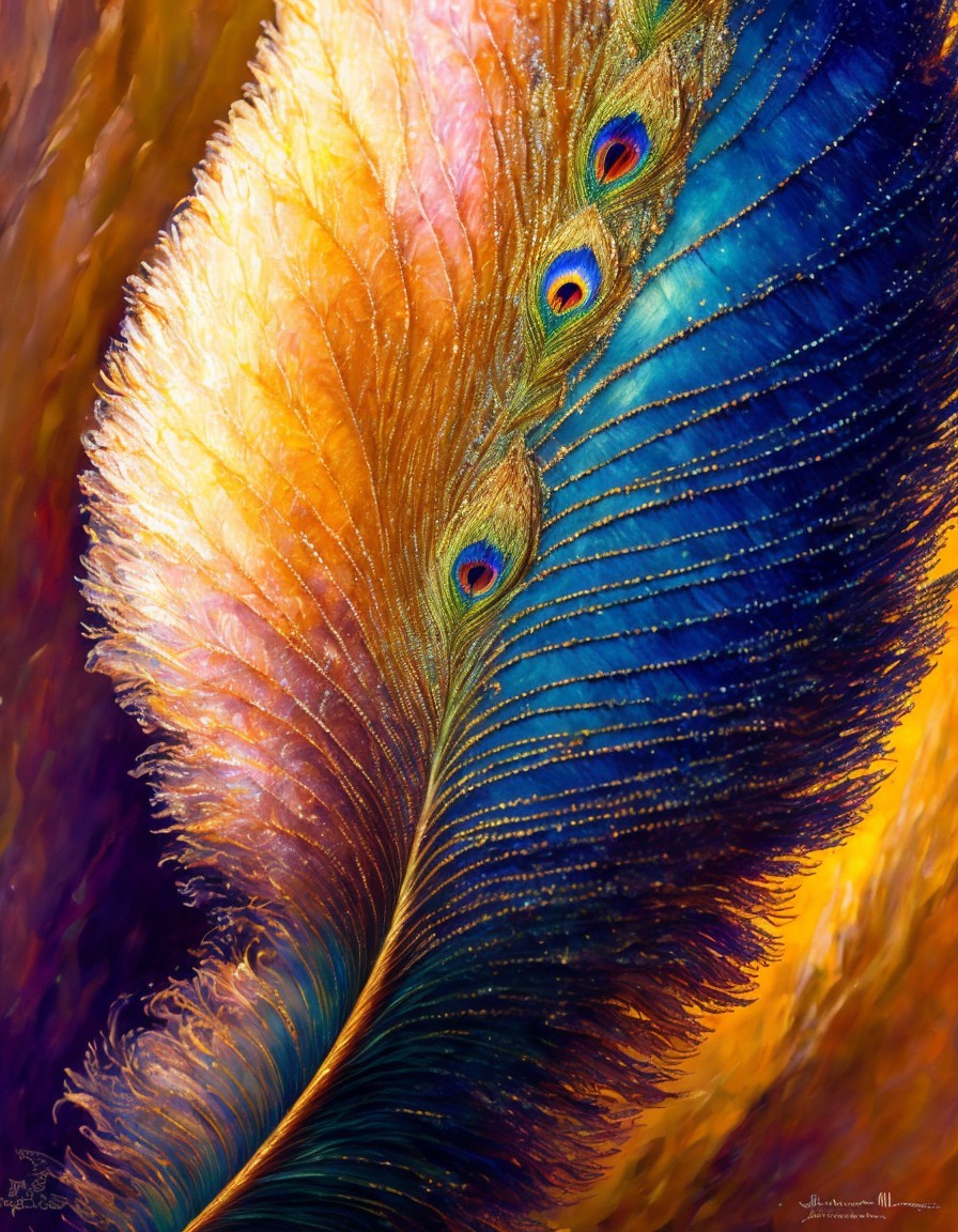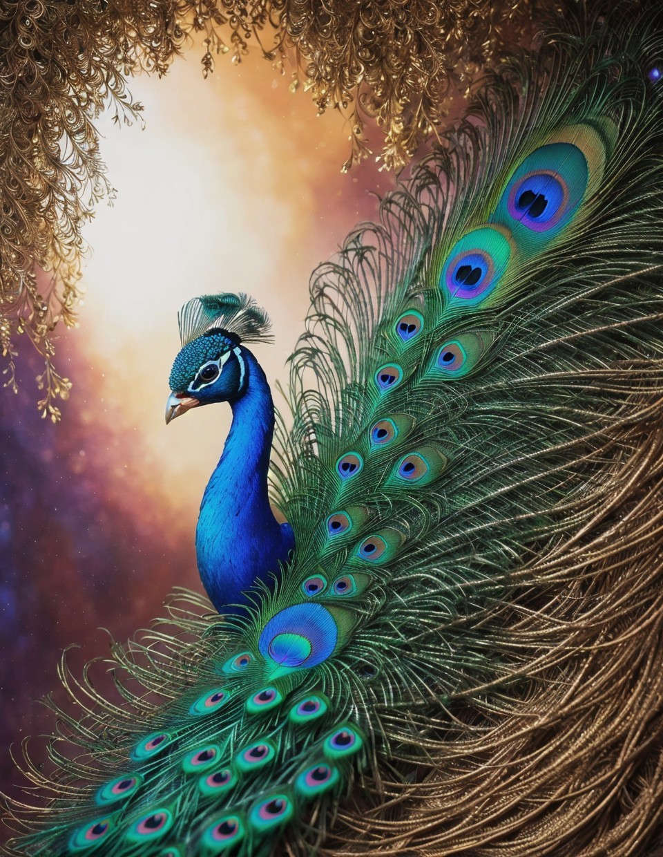 A vibrant artistic depiction of a peacock with its splendid tail feathers fully displayed, set against a warm, ornate background.