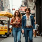 A stylish couple strolls through a vintage urban setting. They both wear denim outfits, with the man in a blue shirt and brown pants, and the woman in a fitted top and jeans, exuding retro charm.
