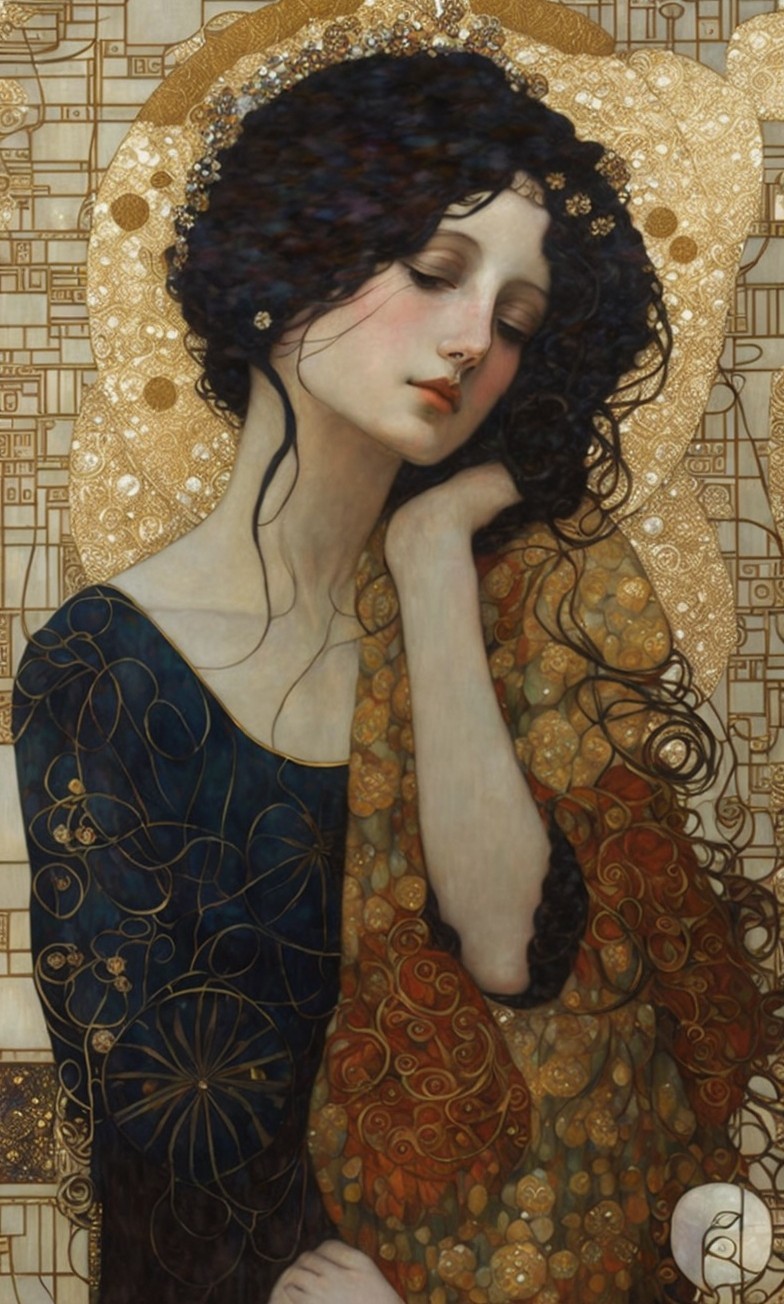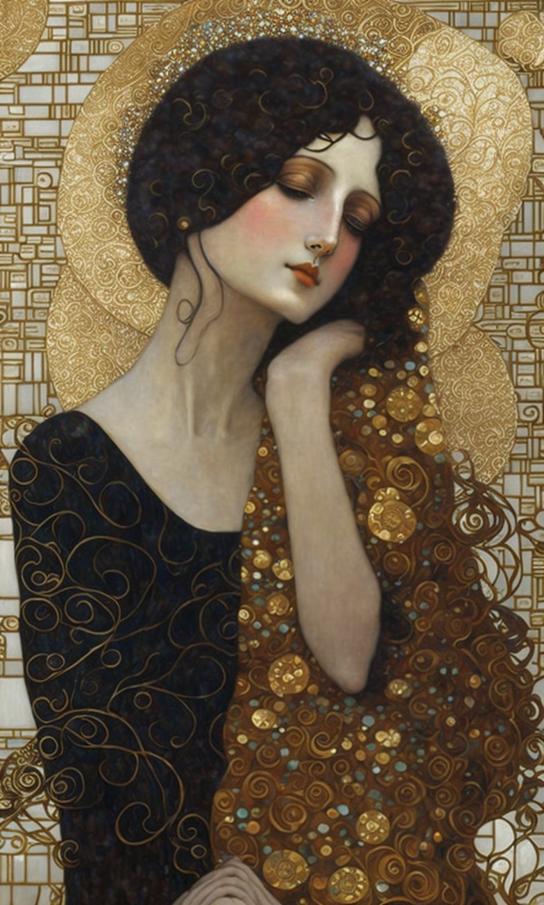 The image features a woman with soft features, wearing a dark dress and draped in a golden shawl. She gazes gently, framed by a radiant halo, with a textured background enhancing the serene vibe.