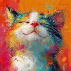 A vibrant, colorful portrait of a cat featuring bold brush strokes. The cat has large, expressive green eyes and a mix of orange, brown, and cream fur, set against a bright, abstract background.