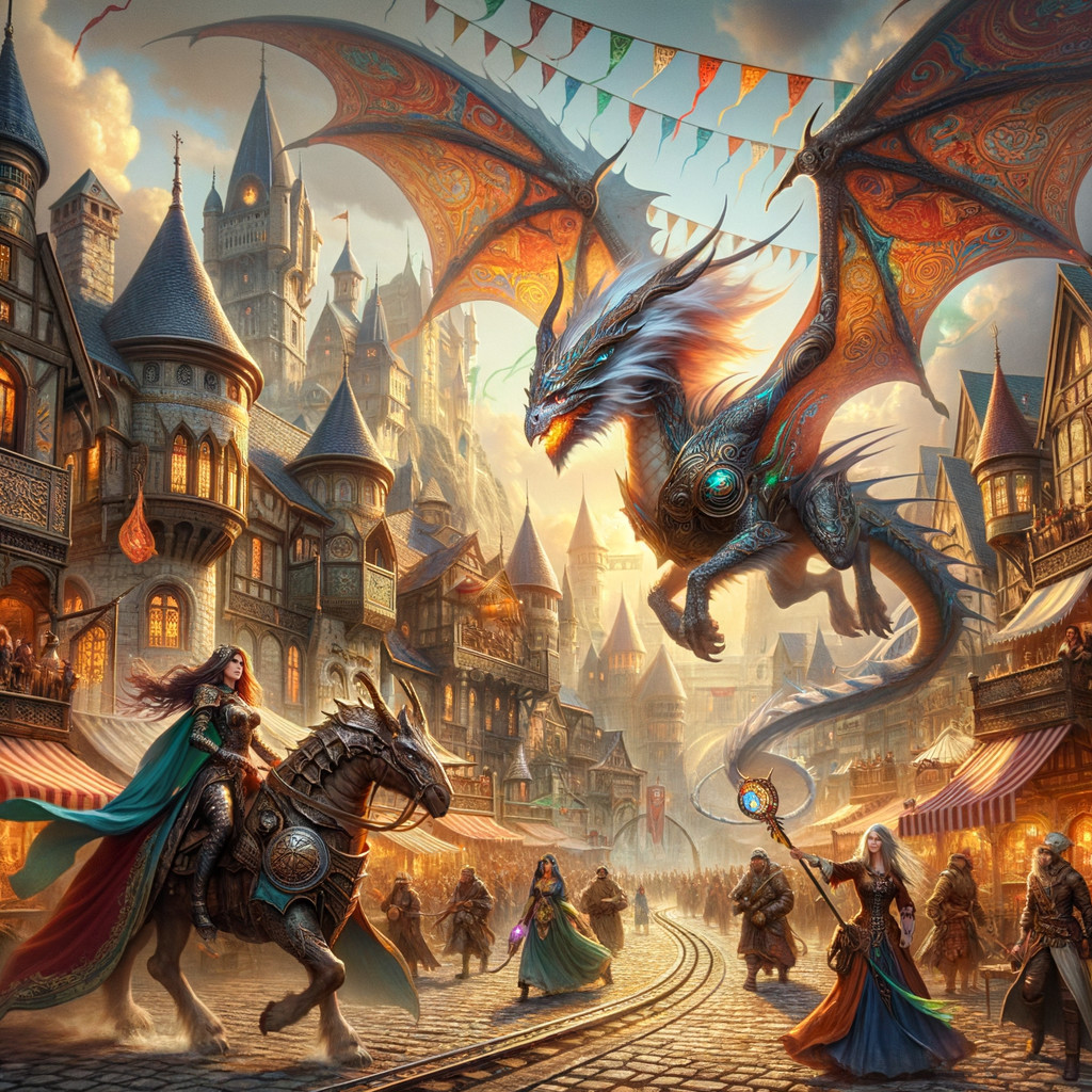Prompt: "Enchanting sorceress, alluring outfit, mythical dragon companion, gliding over Stormwind's ancient skyline in defending fight against a horde warrior on a dragon with leather armor, medieval structures, lively cobblestone streets, towering fortresses, colorful pennants, animated city folk, humans, dwarves, elves, elaborate armor, detailed robes, mystical incantations, radiant glyphs, grand fantasy vista, digital artwork, intricate details, vivid color palette, dynamic illumination, epic fantasy ambiance."