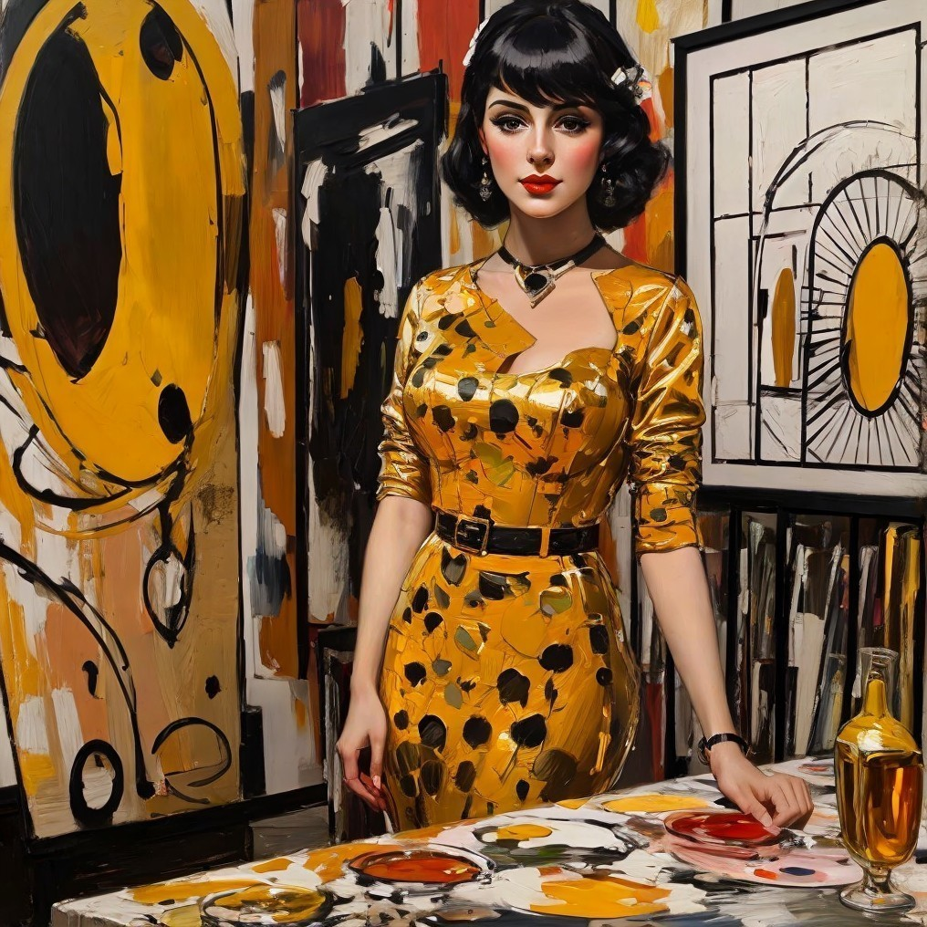A stylish woman in a vibrant yellow polka dot dress stands confidently by a colorful, abstract art-filled backdrop, exuding charm and creativity in a mid-century modern setting.