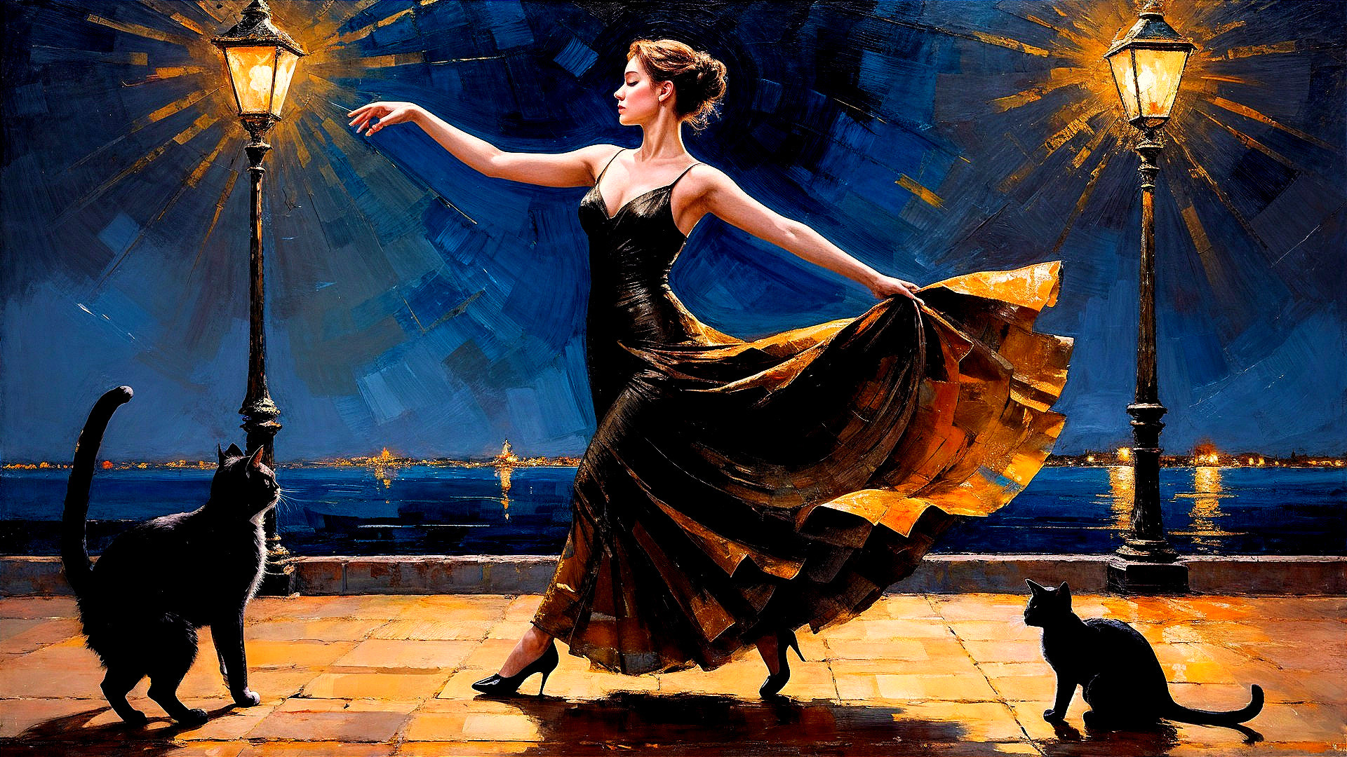 A elegantly dressed woman dances gracefully under streetlights by the water, surrounded by two black cats. The vibrant painting captures a magical, night-time atmosphere.