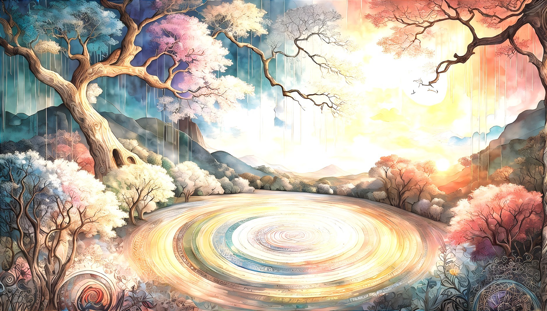 Prompt: zentangle and paisley and mandela patchwork design dreamy sunrise, watercolour patchwork by Picasso and Caspar David Friedrich and Daniel Merriam. Crop circle of wheat