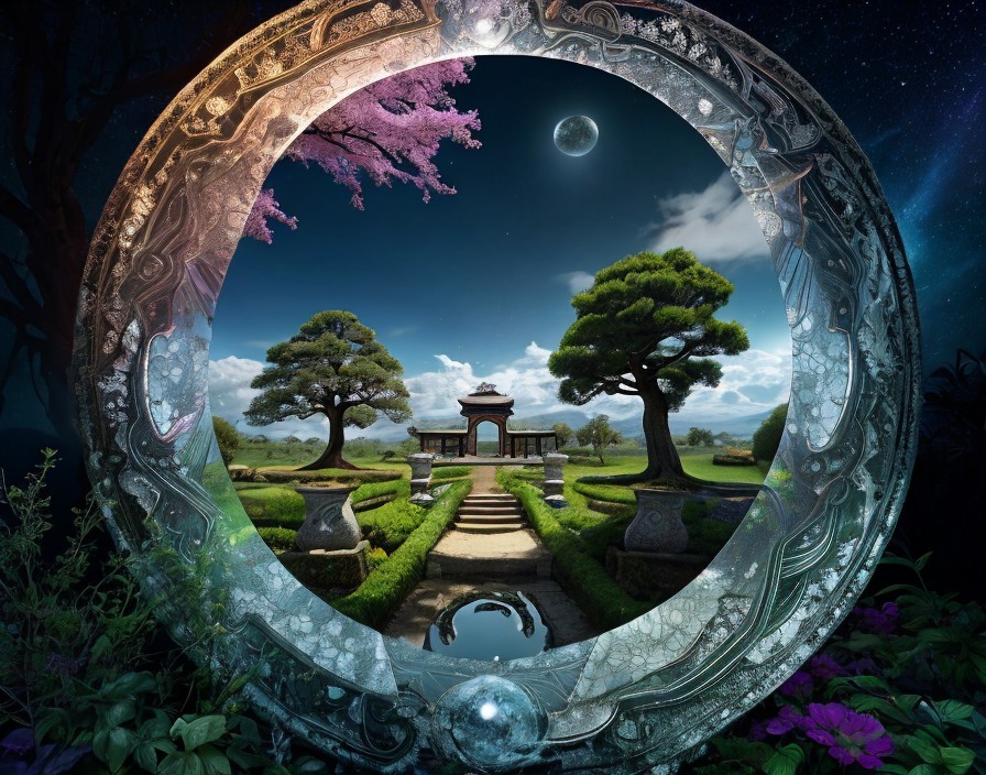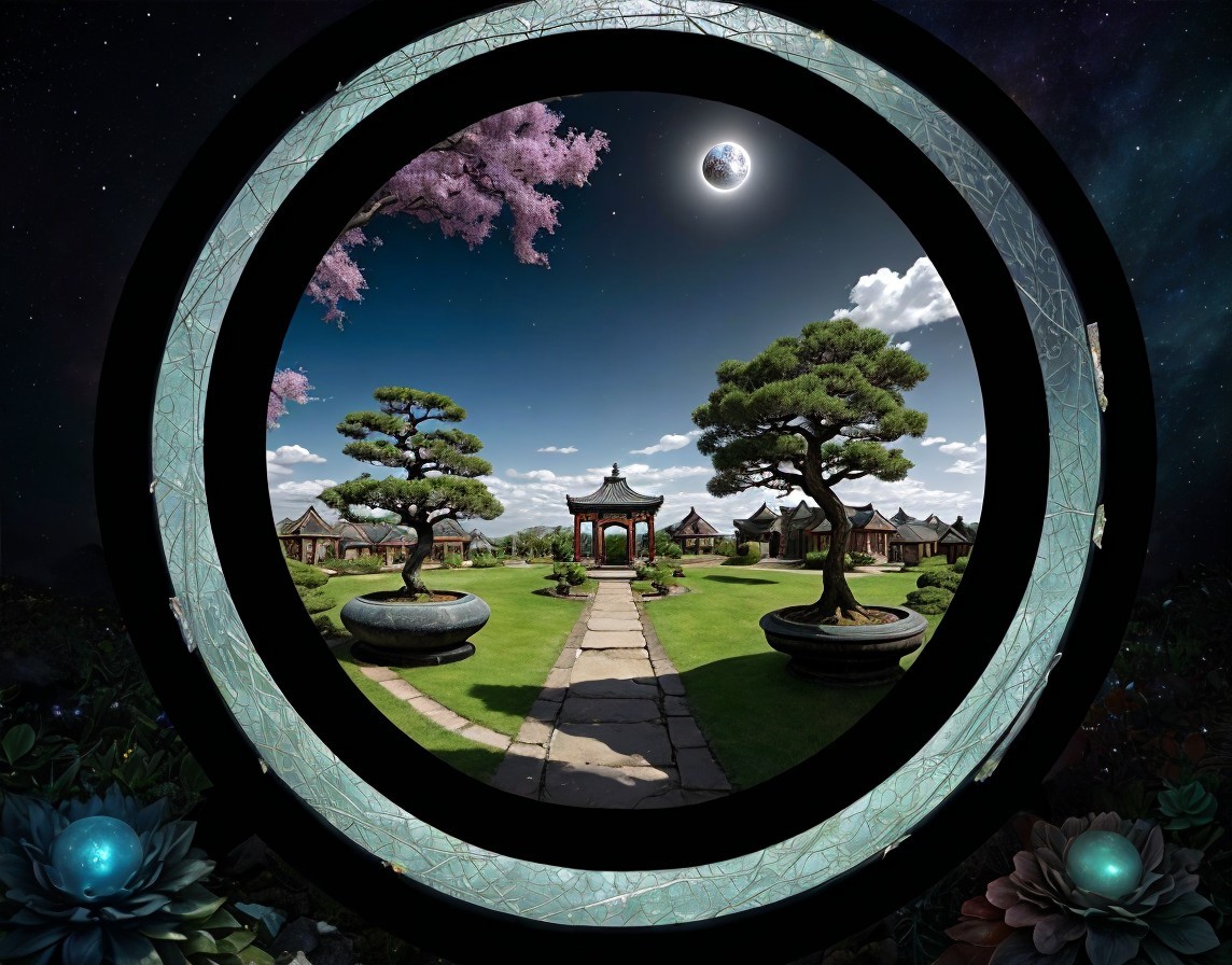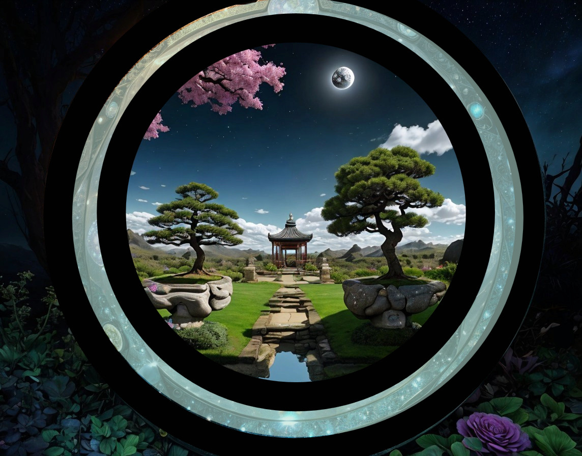 A serene Japanese garden with bonsai, torii gate, and pink blossoms framed by an ornate circular border under a starry sky.
