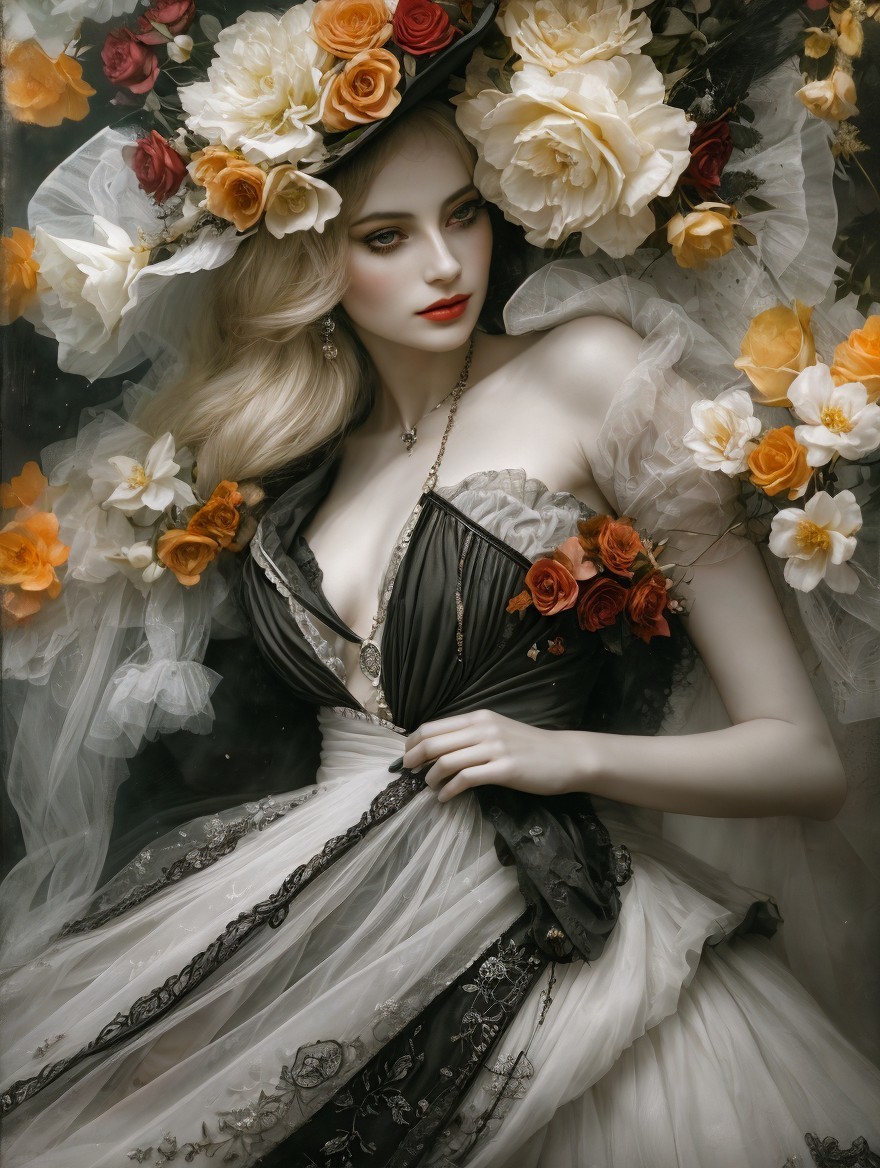 Vintage portrait of a woman with a yellow hat adorned with white flowers, intense gaze, and wearing lace attire.