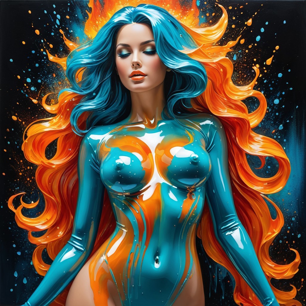 Woman with long, flowing blue and orange hair, wearing a glossy, form-fitting blue and orange bodysuit, with paint splashes in the background, neon color, full body, closed eyes, sensual lips, high shoulders, on a dark background, in the style of abstract expressionism, volumetric lighting.