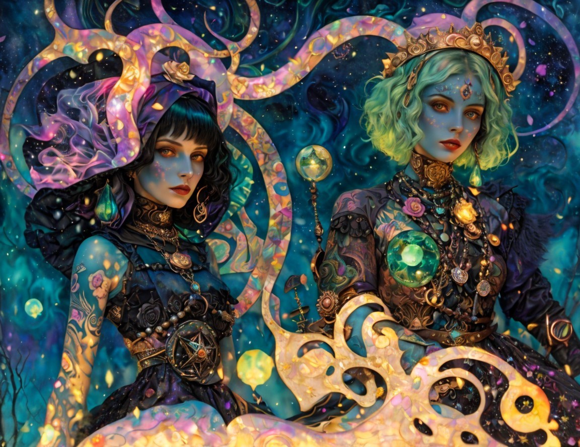 Two fantastical women with ornate headdresses and tattoos are depicted against a swirly, mystical backdrop.