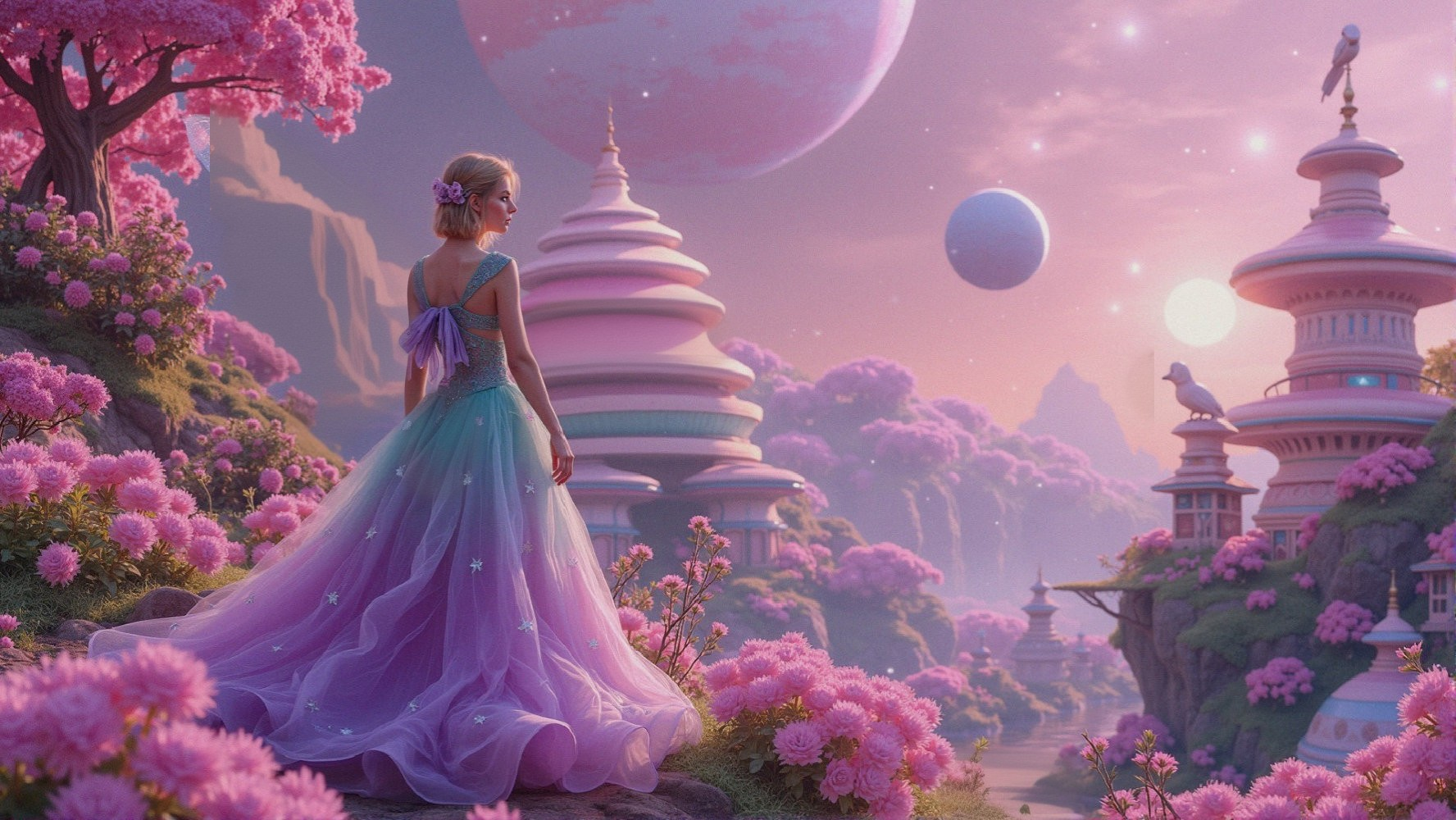 A serene scene features a young woman with flowing teal hair, adorned with flowers, gazing at a fantastical landscape with floating balloons and a majestic castle under a colorful sky.