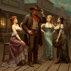 In a nostalgic Wild West setting, a confident cowboy stands center stage, tipping his hat. Three elegantly dressed women, each in colorful gowns, gather around him, exuding charm and allure.
