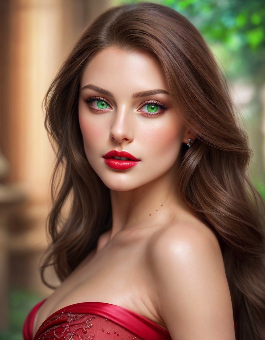 An illustrated portrait of a woman with striking green eyes, wavy brown hair, and red lips set against a whimsical background with floating petals.