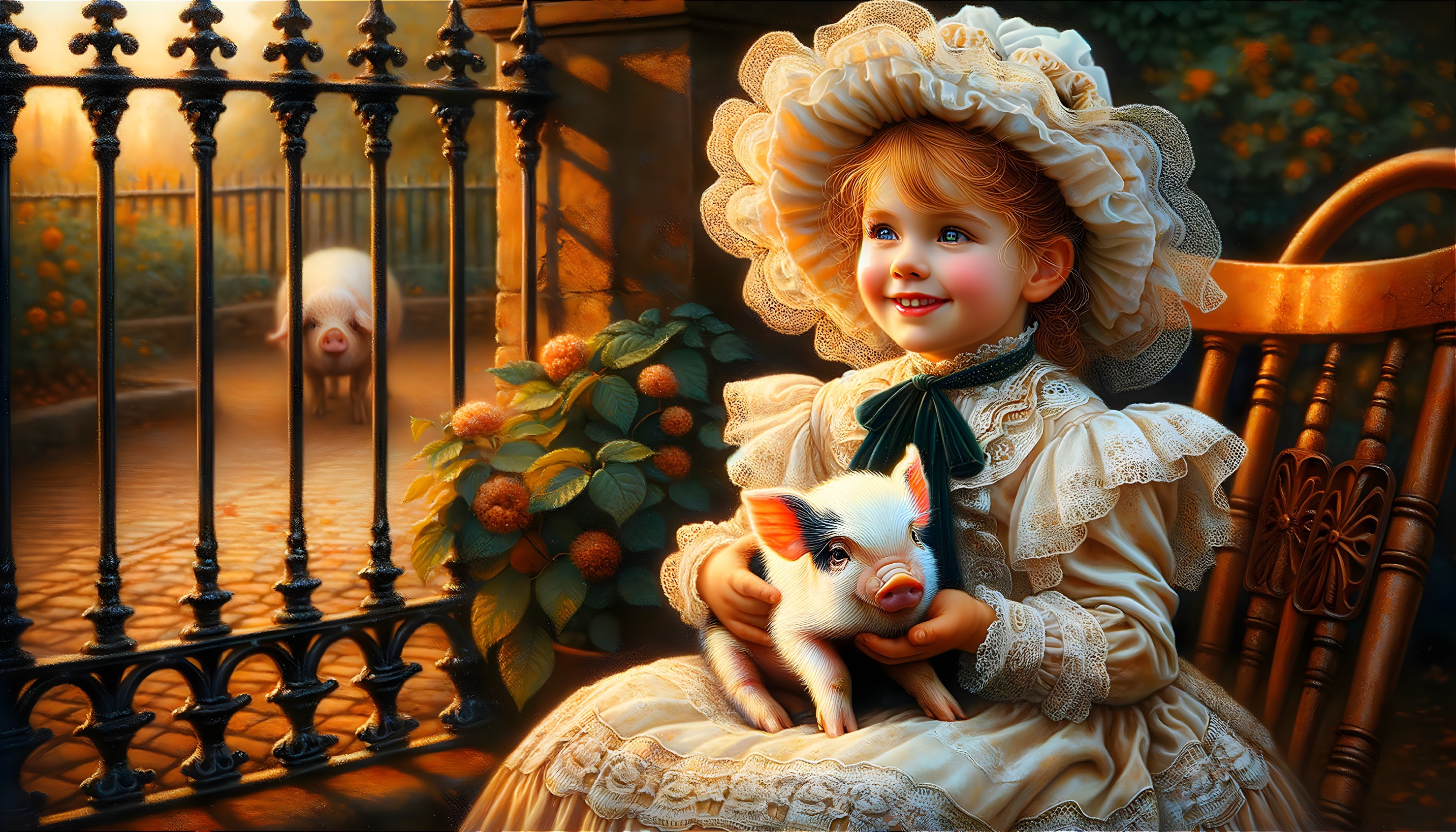 An exquisite painting showcases a young Victorian girl in a petting zoo, cradling a piglet with wonder and joy. The detailed scene includes Victorian elements, elegant attire, and a warm, inviting glow, capturing the essence of innocent delight.