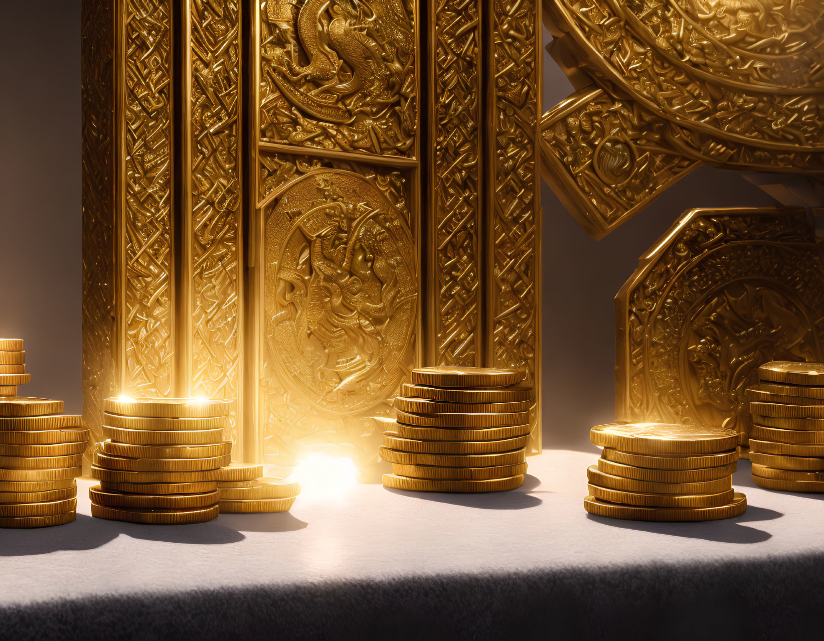 Intricate golden door surrounded by coins and orbs depicts fantasy treasure vault