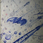 The image features intricate blue illustrations depicting a cosmic scene with spaceships, celestial bodies, and swirling patterns, all set against a lined background that enhances its artistic depth.