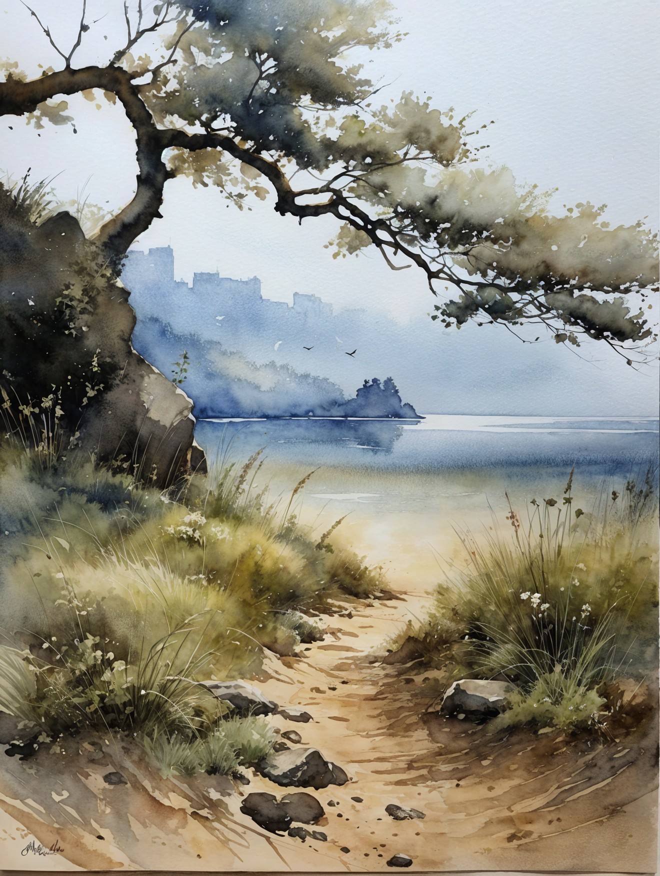 A serene landscape featuring a winding path through soft hills, adorned with gentle grasses and vibrant orange flowers, under a cloudy sky, with a solitary tree adding depth.