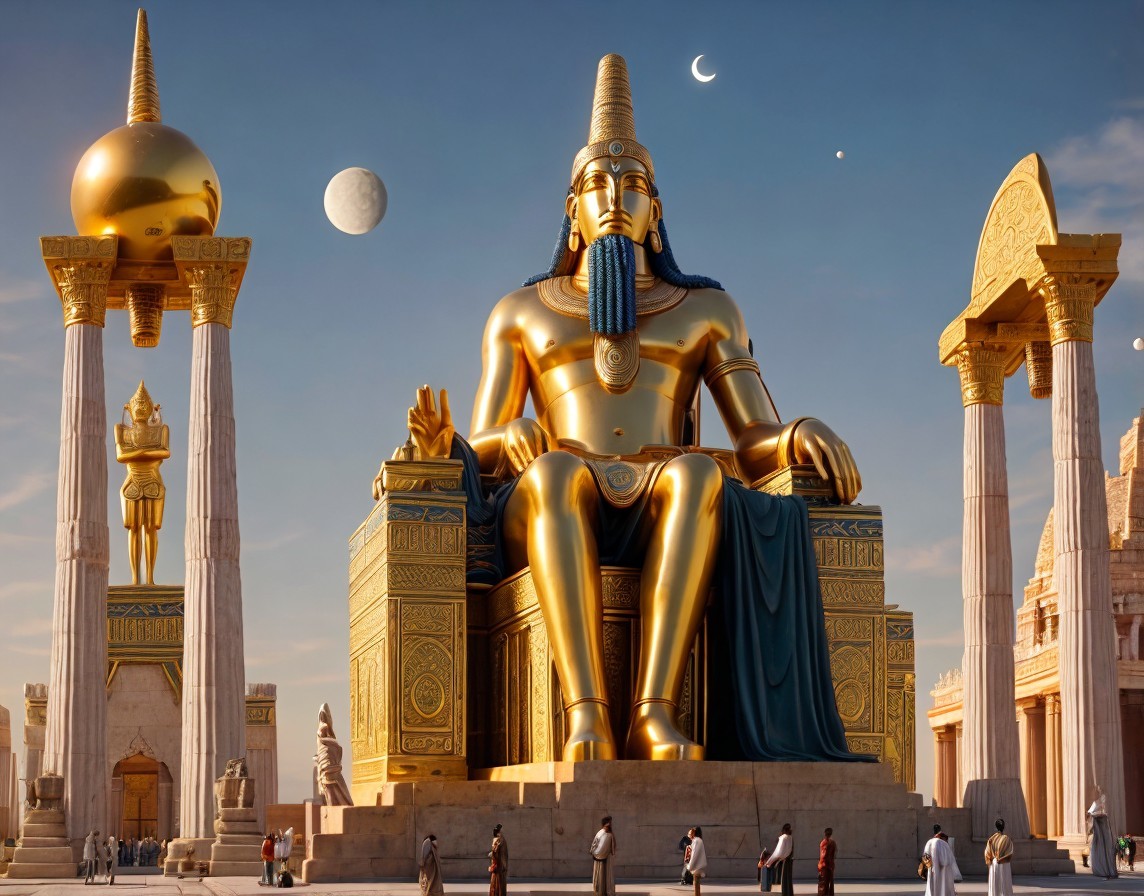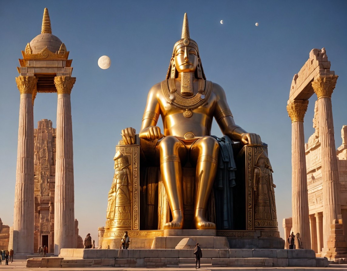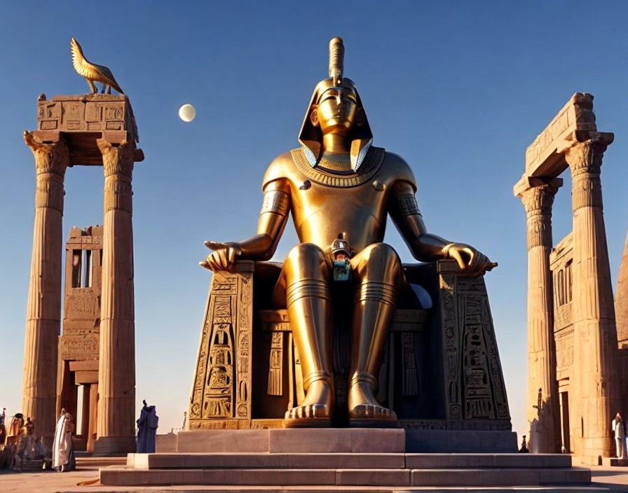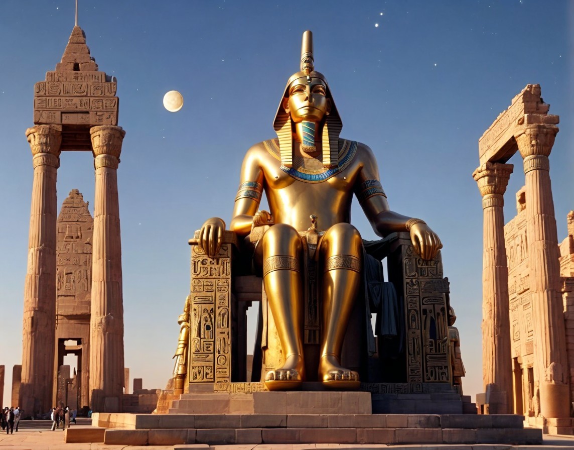 A colossal golden statue of a pharaoh sits majestically between two pillars under a blue sky, with onlookers admiring its grandeur.