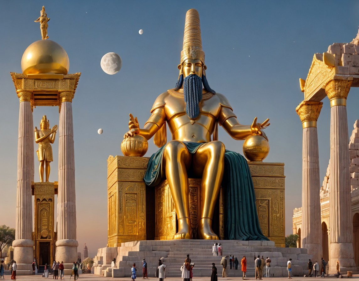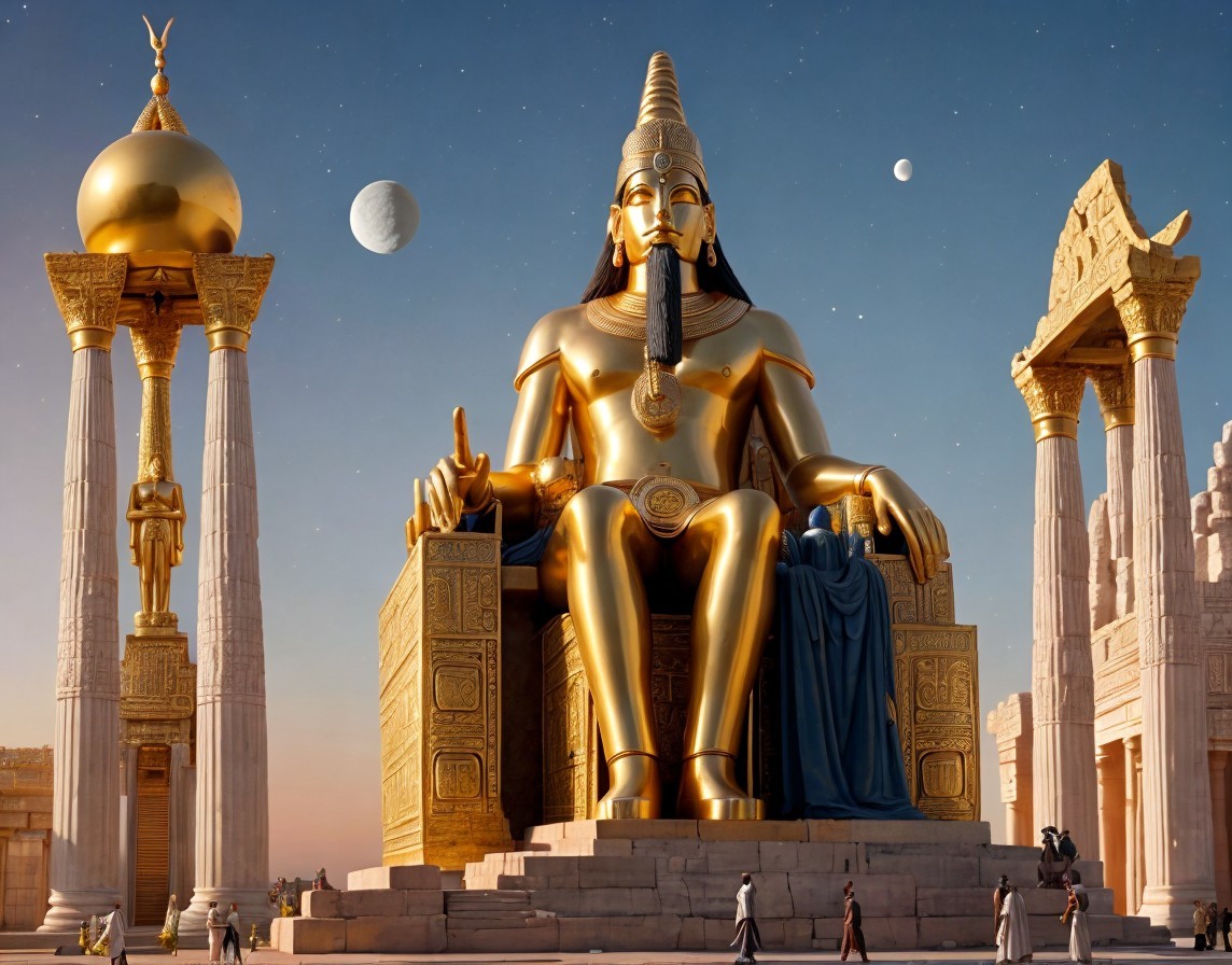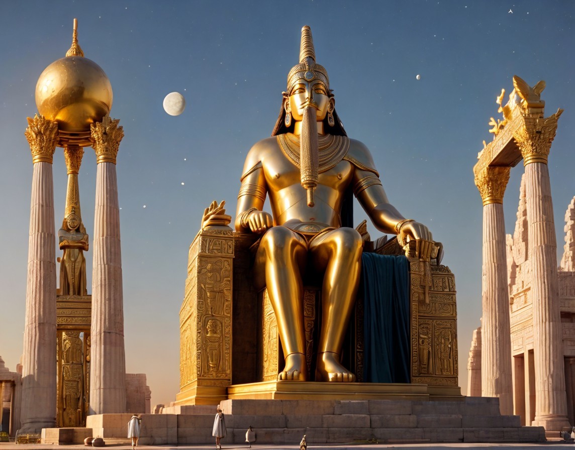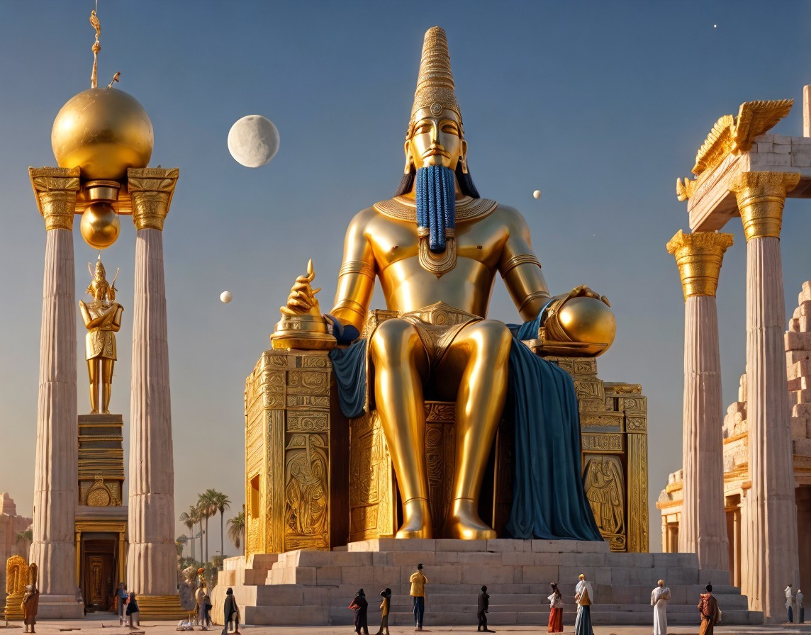 A colossal golden statue of a pharaoh sits majestically between two pillars under a blue sky, with onlookers admiring its grandeur.