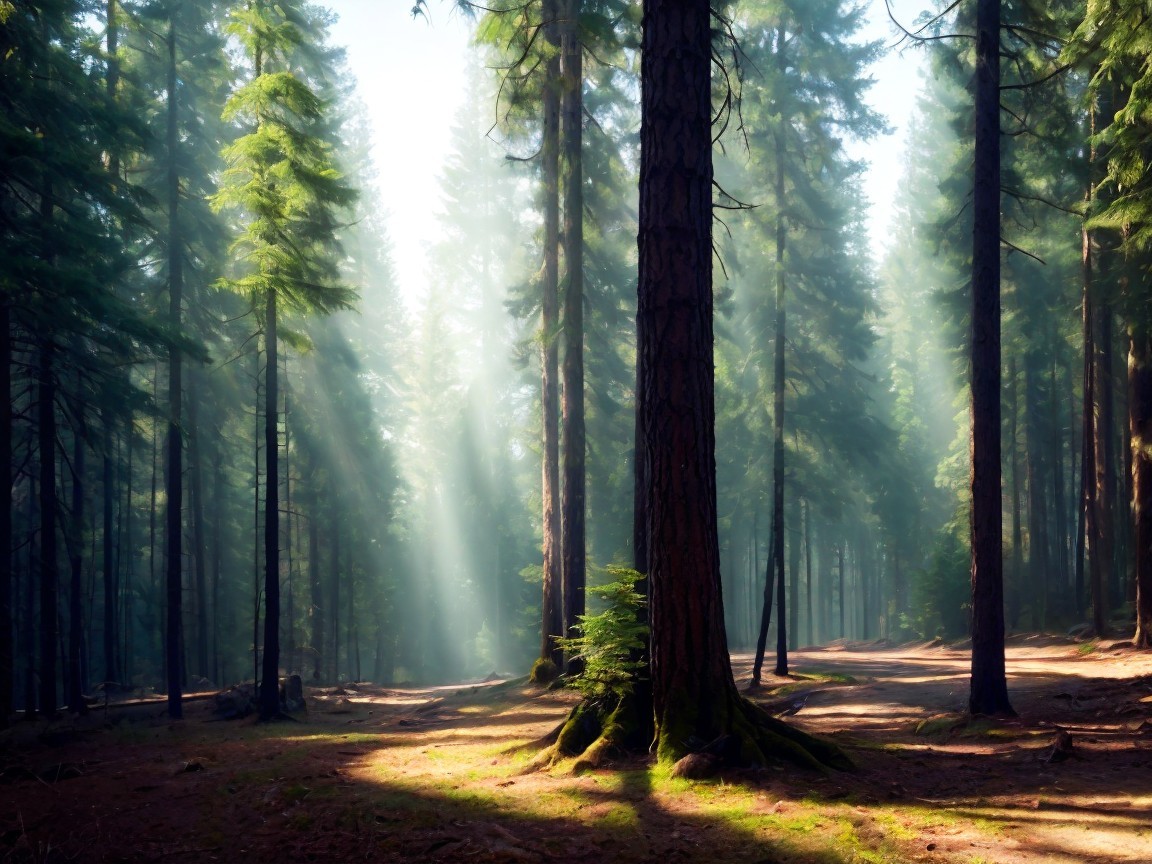 A vibrant parrot stands in a lush forest, surrounded by tall trees and thick greenery. Sunlight streams through the leaves, creating a mystical, serene atmosphere.