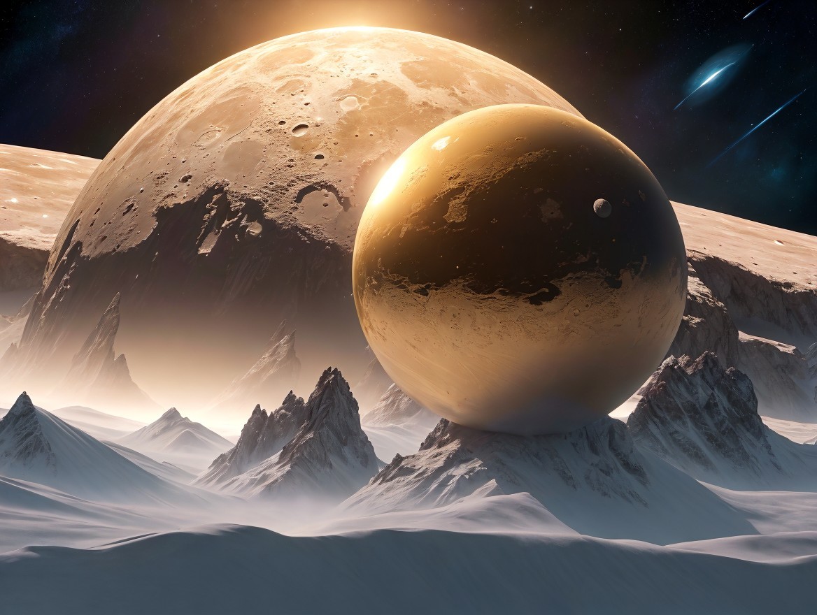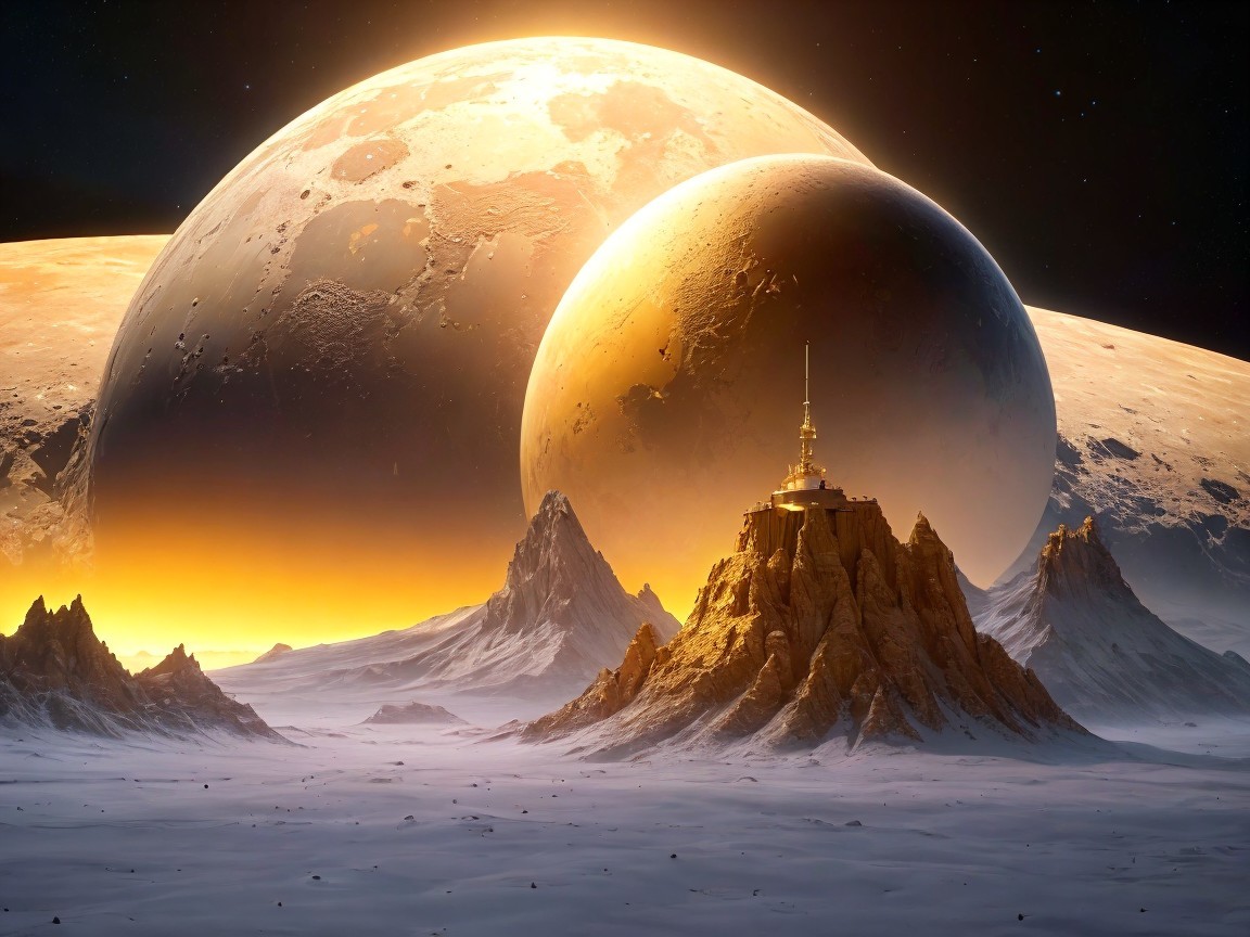 An astronaut stands on a rocky lunar surface, gazing at a large, cratered moon in the background. The scene is illuminated by a bright sun, with distant planets visible in the dark sky.